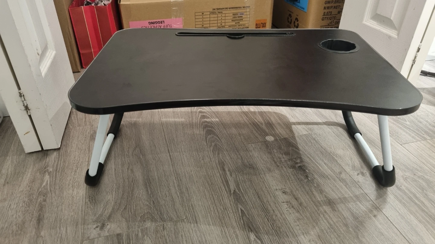 This portable laptop desk is black and features a built-in cup holder and a slot for a tablet or phone. Its legs fold for easy storage and transport. It's great for working or relaxing anywhere!