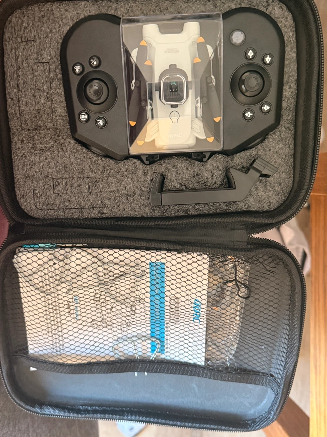 This is dual camera 4K drone with obstacle avoidance setting. It includes the remote controller bumpers to protect propeller blades, extra set of propeller blades and a carrying case. The case has a mesh pocket for manuals and accessories.