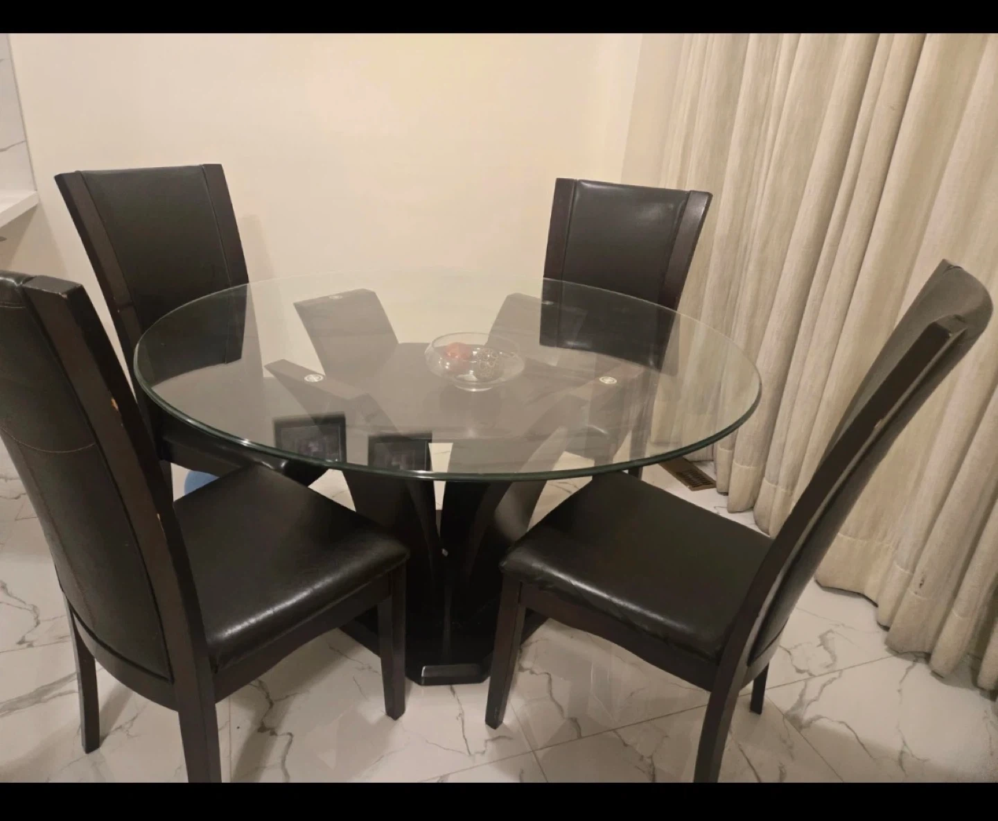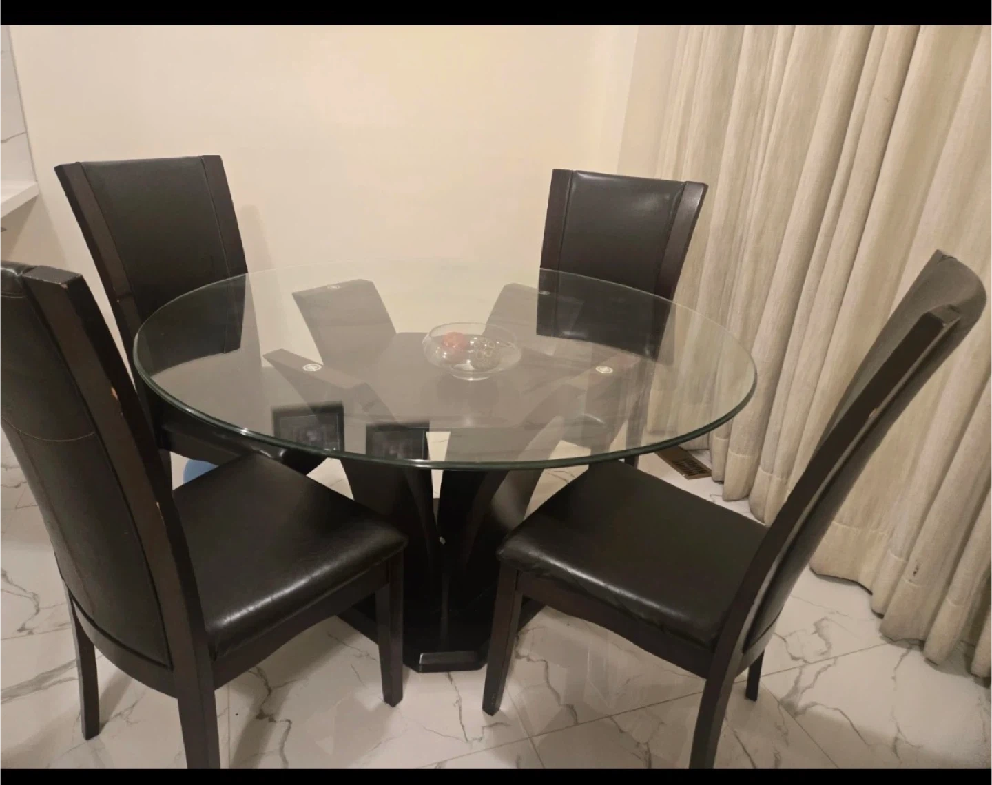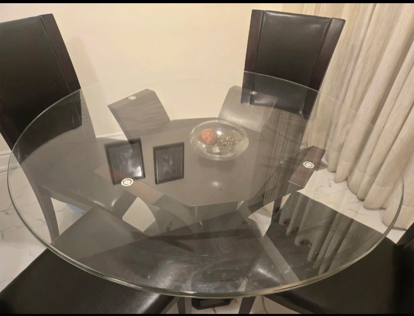 Round glass top dining table with four dark leatherette chairs. The table has a unique dark wood pedestal base. It's a nice set for smaller dining areas. Table seats four comfortably. You can buy them separately! The chairs or the table. Pick up only!π₯π₯no delivery!
