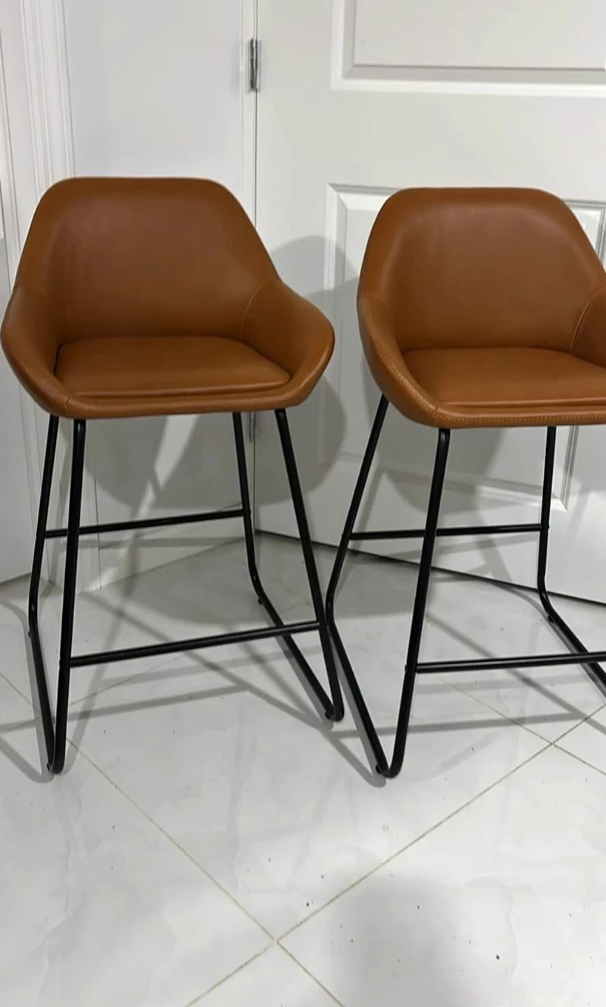 These bar stools feature comfortable brown faux leather upholstery and a modern design. They have sturdy black metal legs and a built-in footrest. Perfect for a kitchen island or home bar!