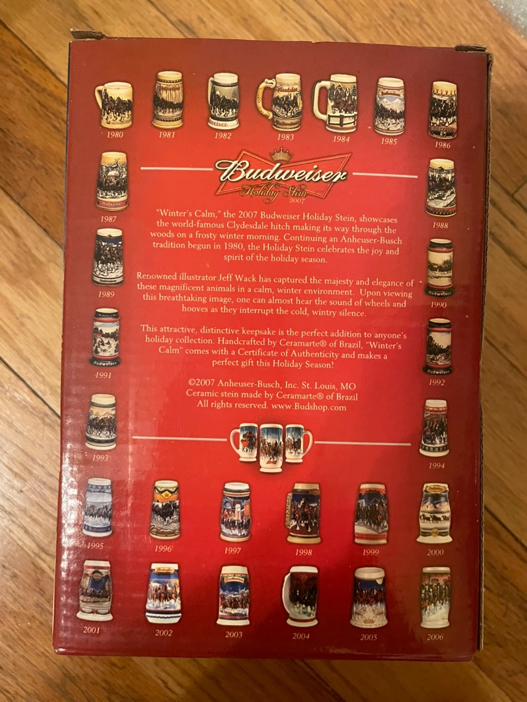 This Budweiser Holiday Stein, "Winter's Calm," showcases the world-famous Clydesdale hitch on a frosty winter morning. It's part of the 2007 holiday collection. Crafted by Ceramarte of Brazil, it includes a Certificate of Authenticity.