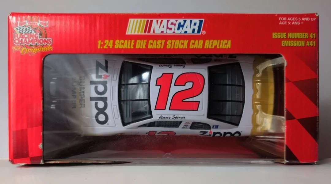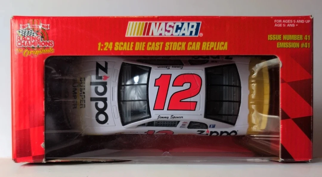 This is a 1:24 scale die-cast stock car replica from Racing Champions The Originals series. It features a Zippo Monte Carlo design with Jimmy Spencer's name. It's a collectible item for racing enthusiasts. Recommended for ages 5 and up.