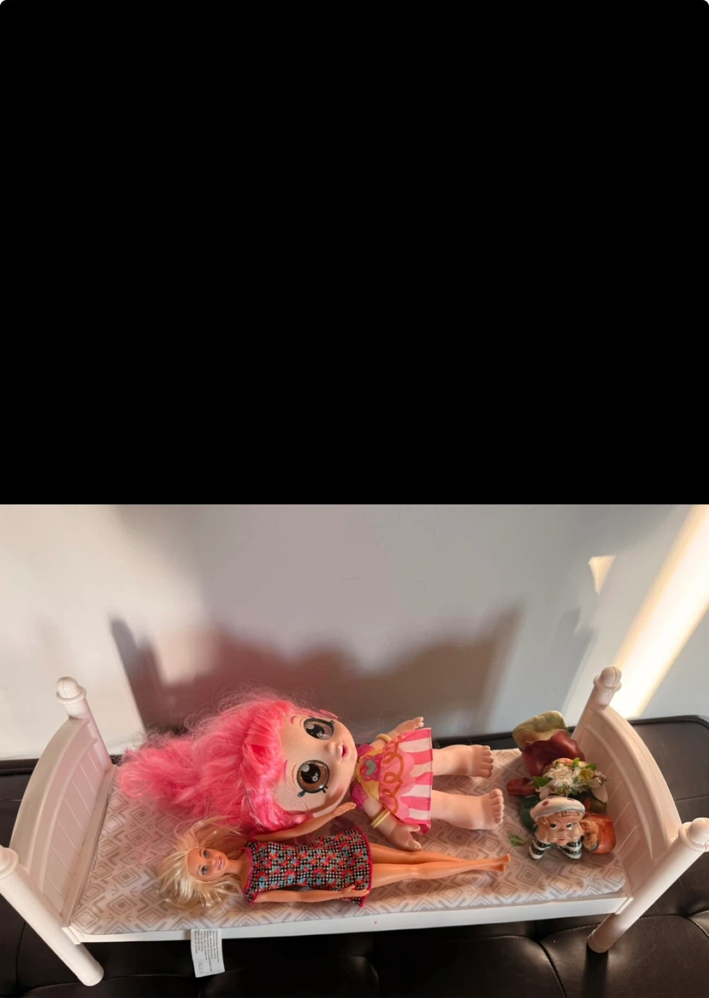 This is a toy doll bed featuring two dolls and The bed is white with a patterned mattress. It's perfect for imaginative play!