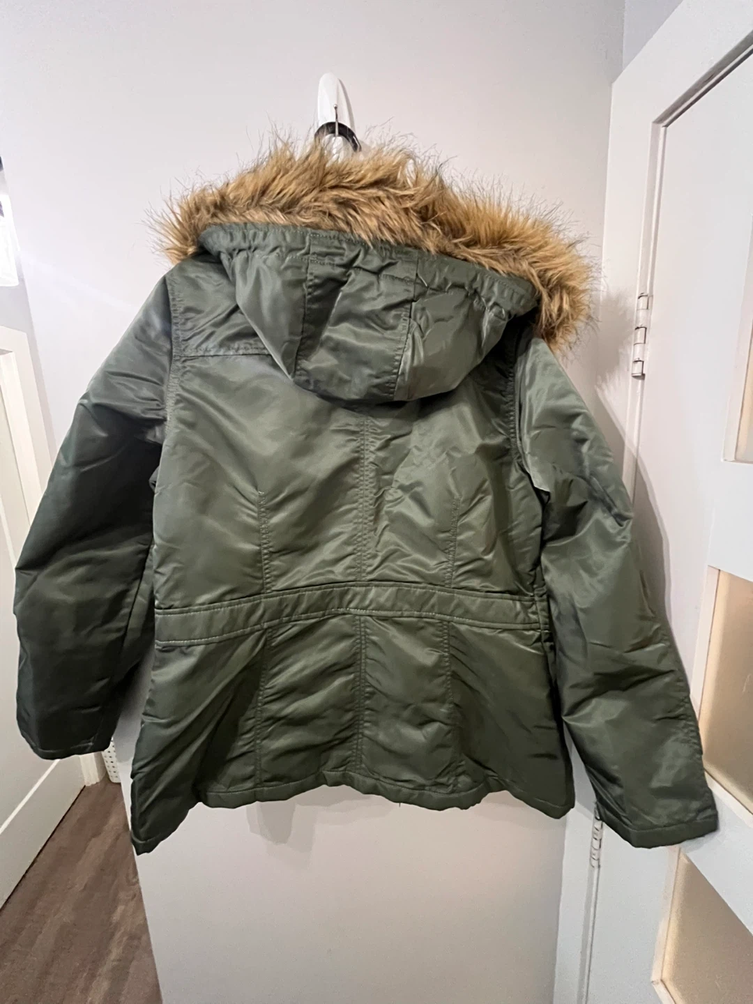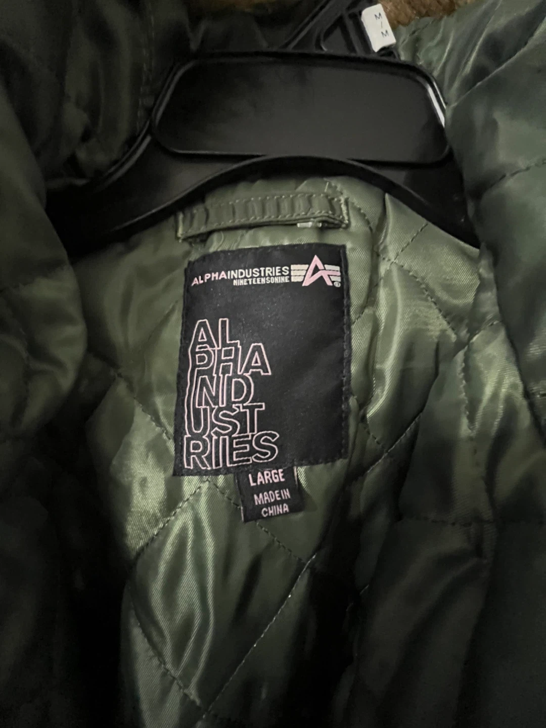 This Alpha Industries parka jacket is a size large and features a faux fur-lined hood. It's designed for warmth and durability. It has multiple pockets for convenience.
