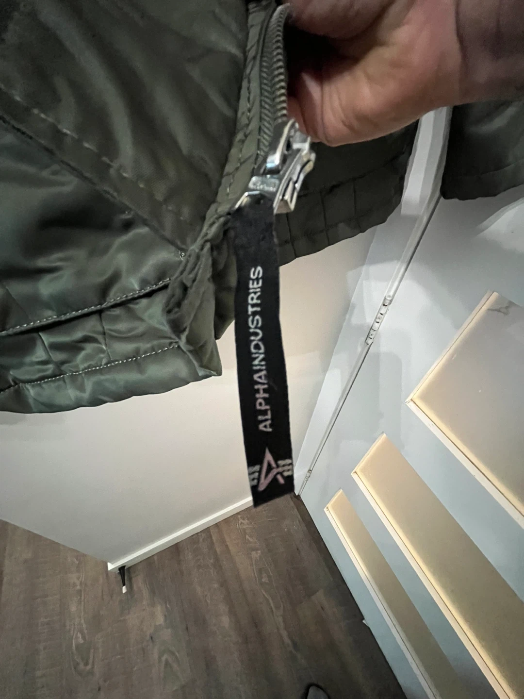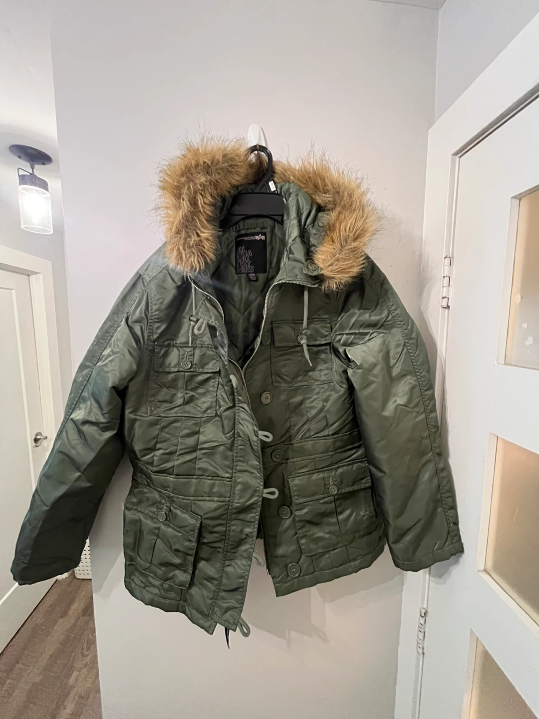 This Alpha Industries parka jacket is a size large and features a faux fur-lined hood. It's designed for warmth and durability. It has multiple pockets for convenience.