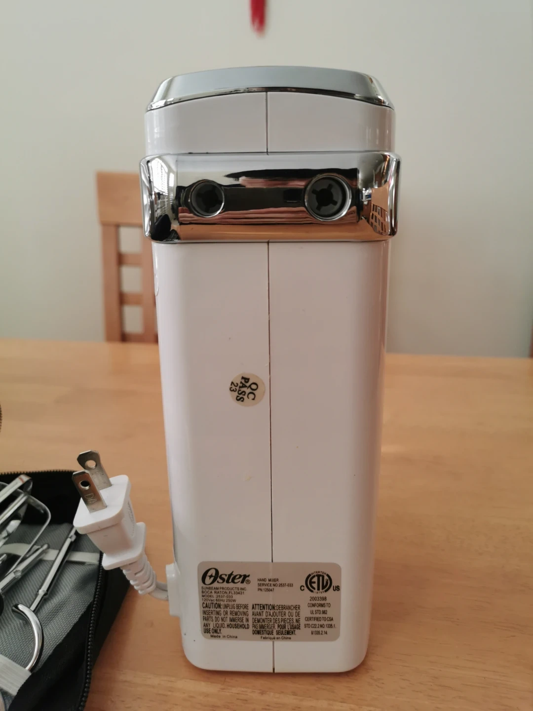This Oster hand mixer comes with a handy storage case and multiple attachments. It's white with chrome accents and includes beaters and a whisk. Great for all your baking needs!
