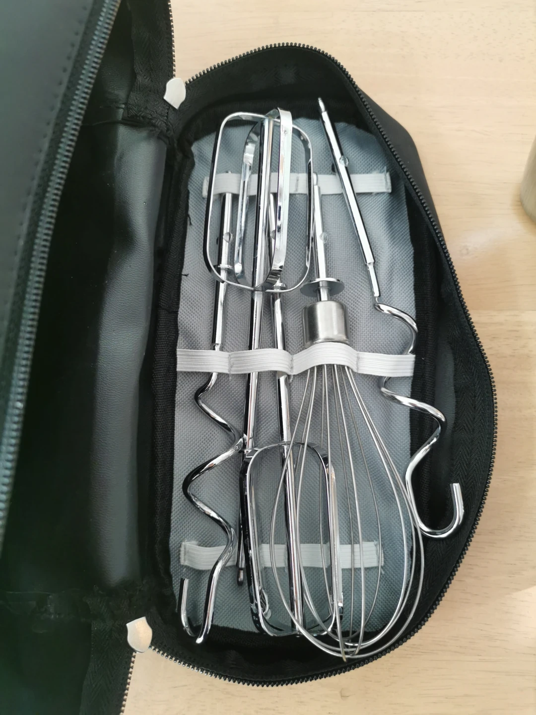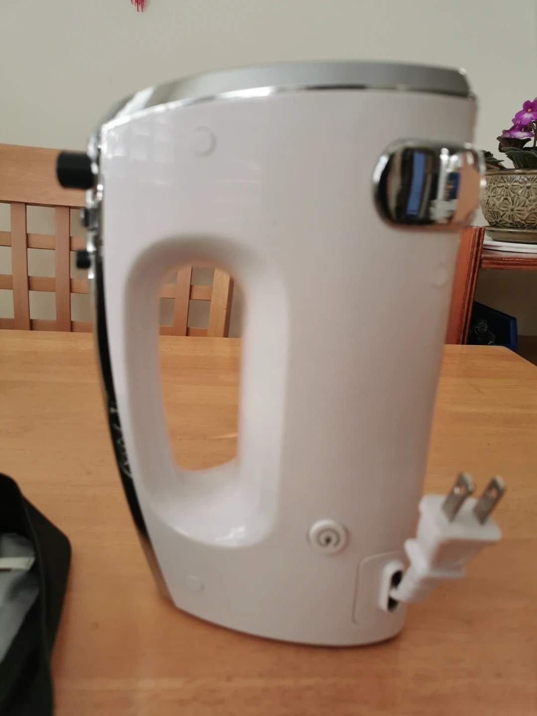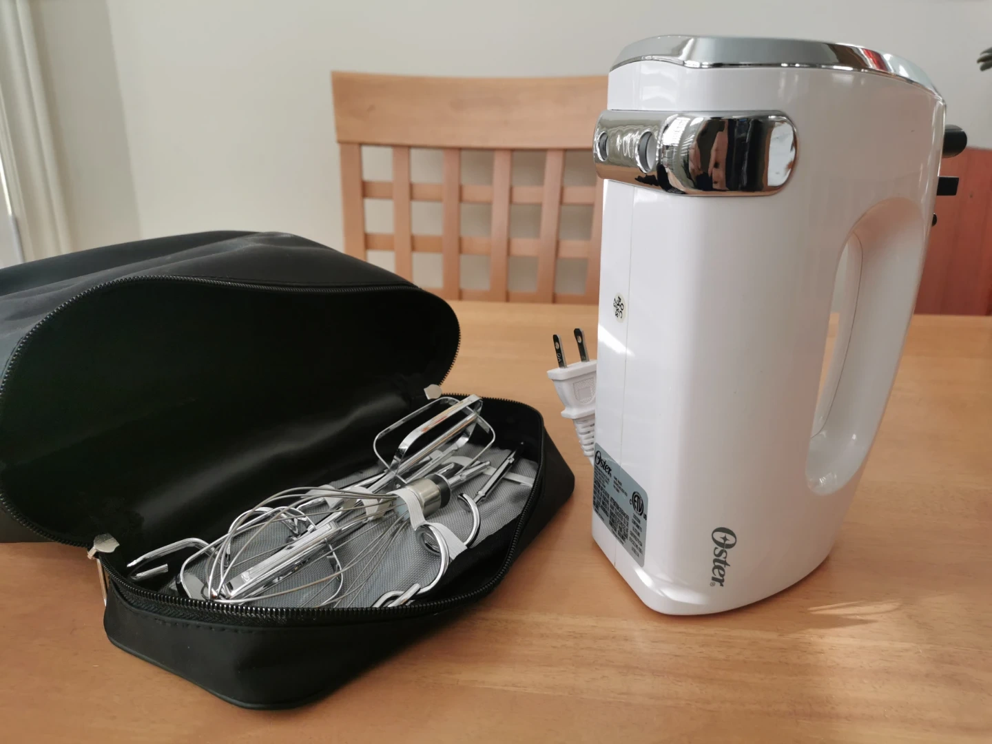 This Oster hand mixer comes with a handy storage case and multiple attachments. It's white with chrome accents and includes beaters and a whisk. Great for all your baking needs!