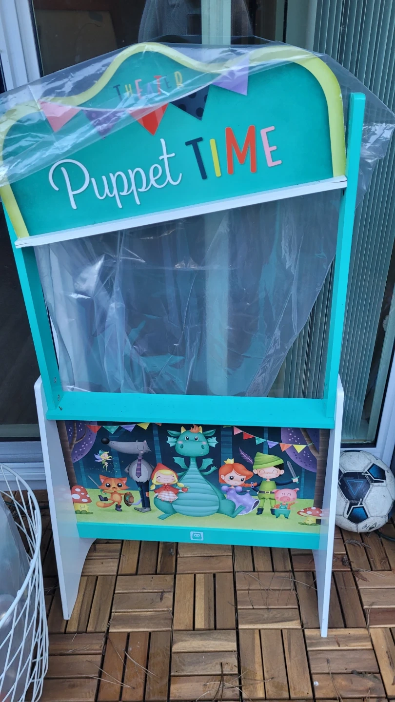 A fun puppet theatre for playtime. It features a colourful design with characters like a dragon and fairies. The plastic curtain is included. Needs a new family..
