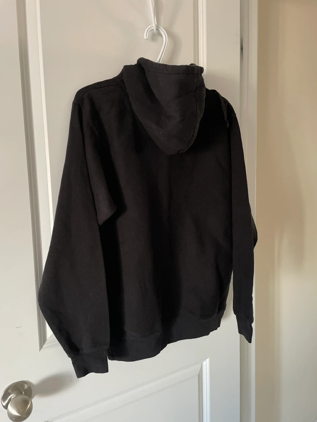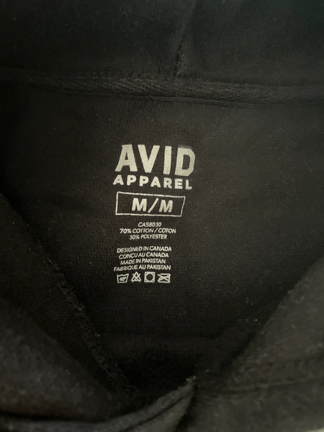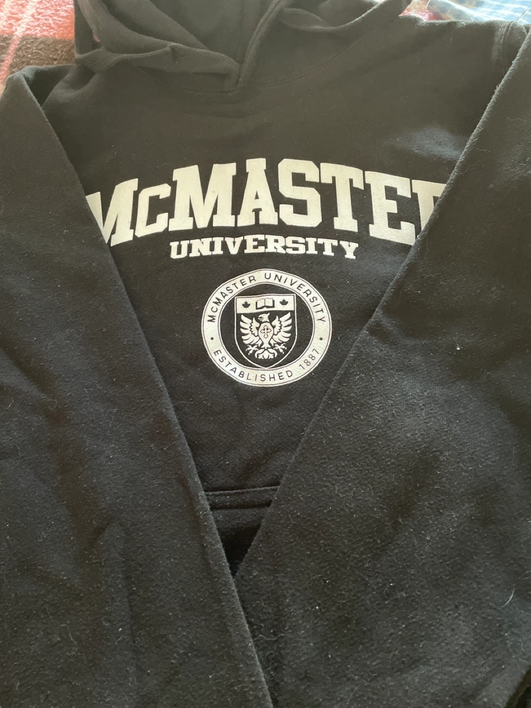 This black hoodie features the McMaster University logo. It's made from a 70% cotton and 30% polyester blend. Designed in Canada, it's size medium.