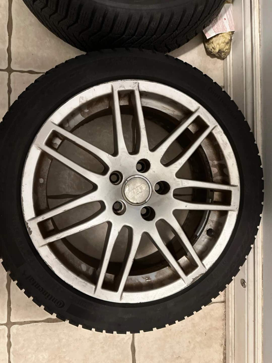 Selling a set of Audi rims with Continental winter tires. The tire size is 225/45 R17. They are a bit dirty but in good condition otherwise