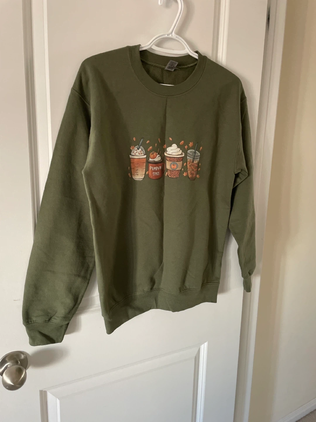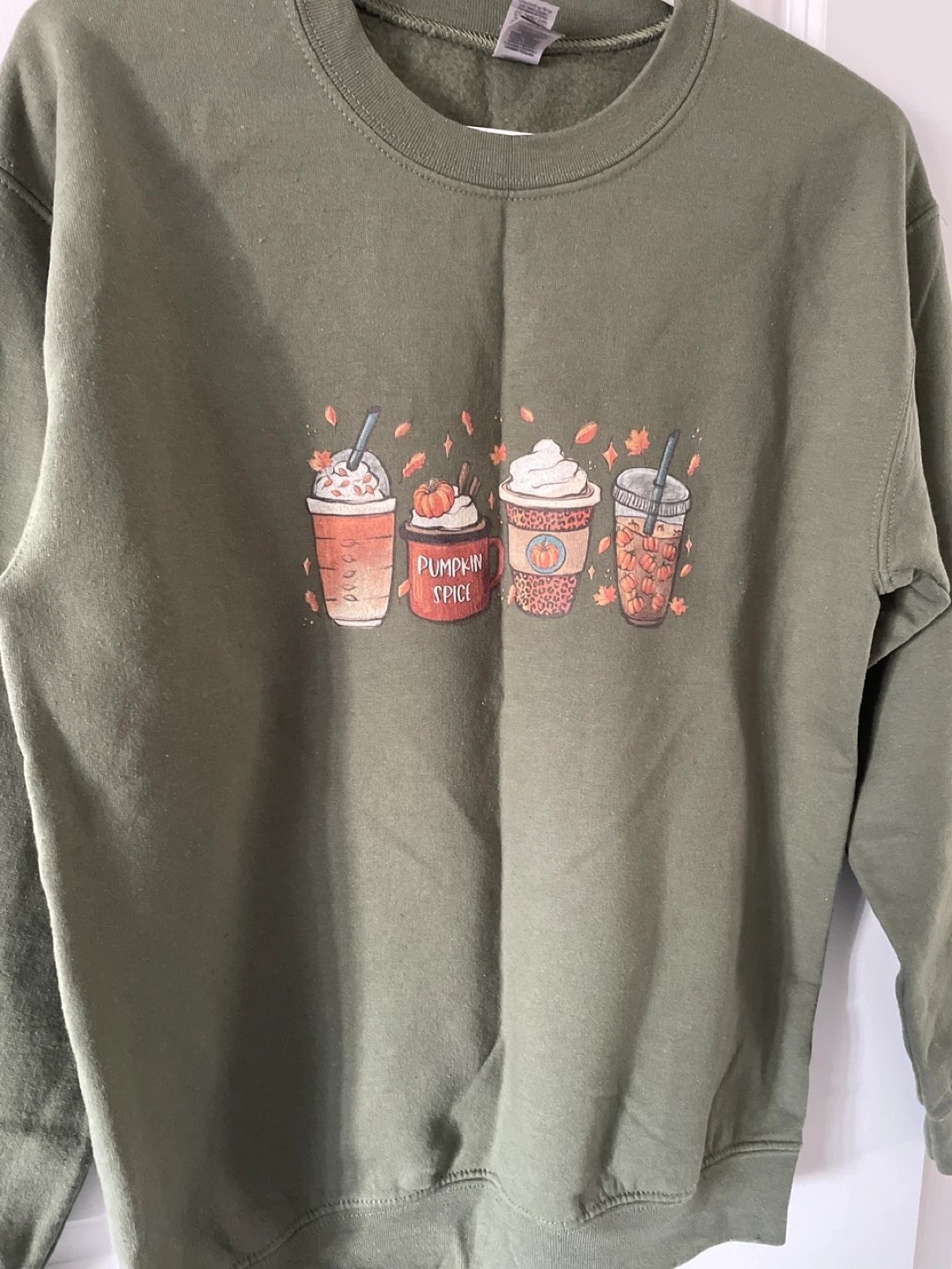 Olive green Gildan Heavy Blend crewneck sweatshirt with a "Pumpkin Spice" graphic featuring four coffee cups. Made in Honduras. Size small.