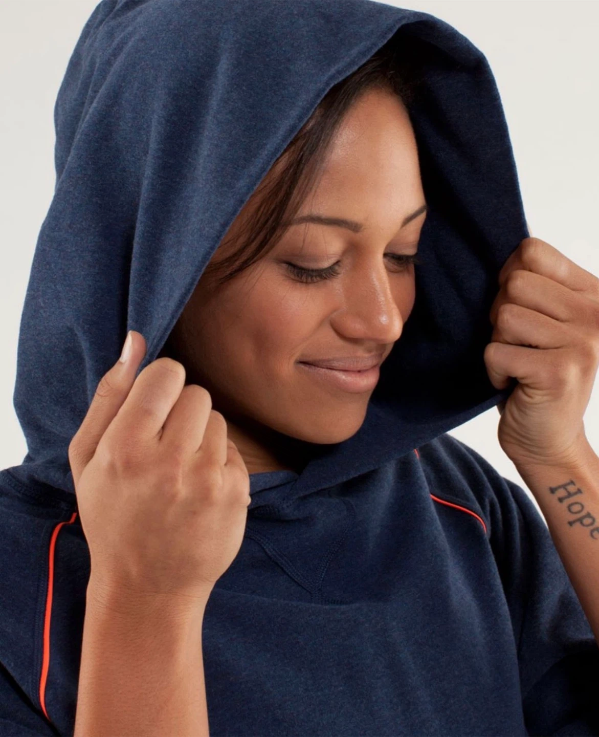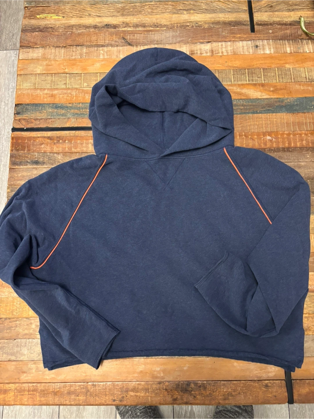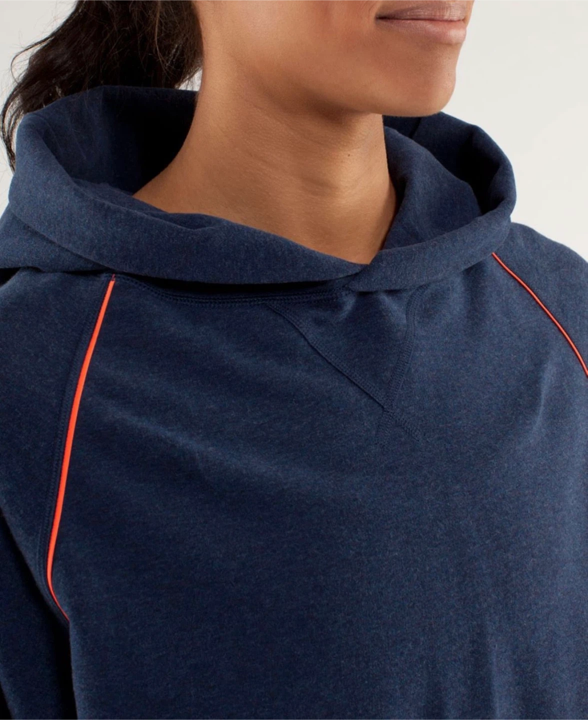 A comfy Lululemon hoodie in a navy blue heathered fabric. It features bright orange piping accents along the raglan seams and a relaxed, cropped fit. This pullover style has a cozy hood and long sleeves, perfect for casual wear.