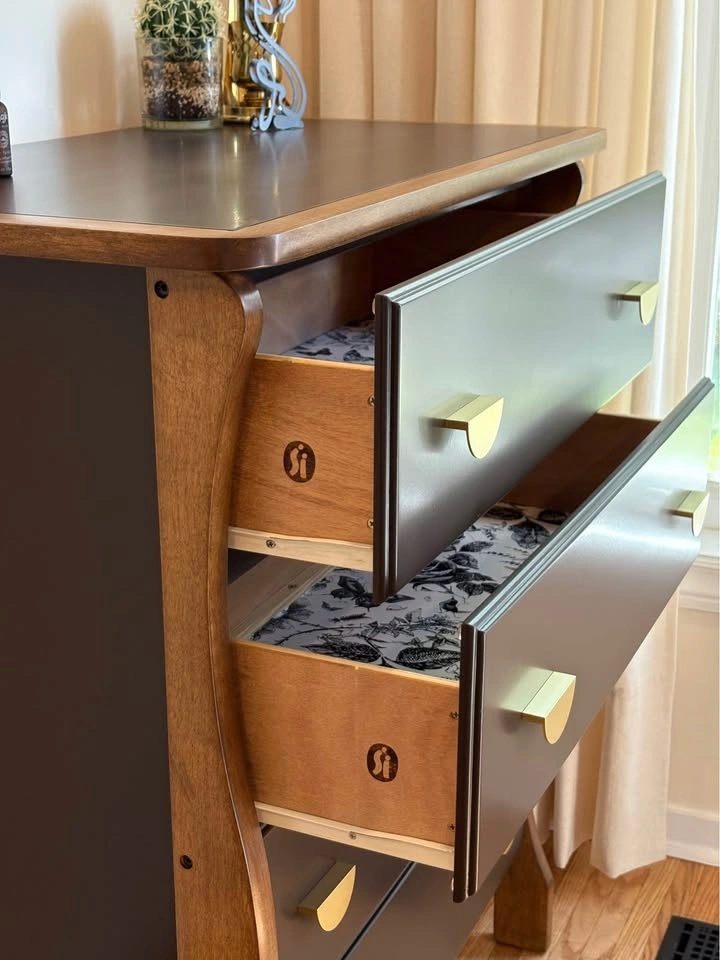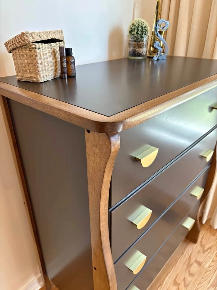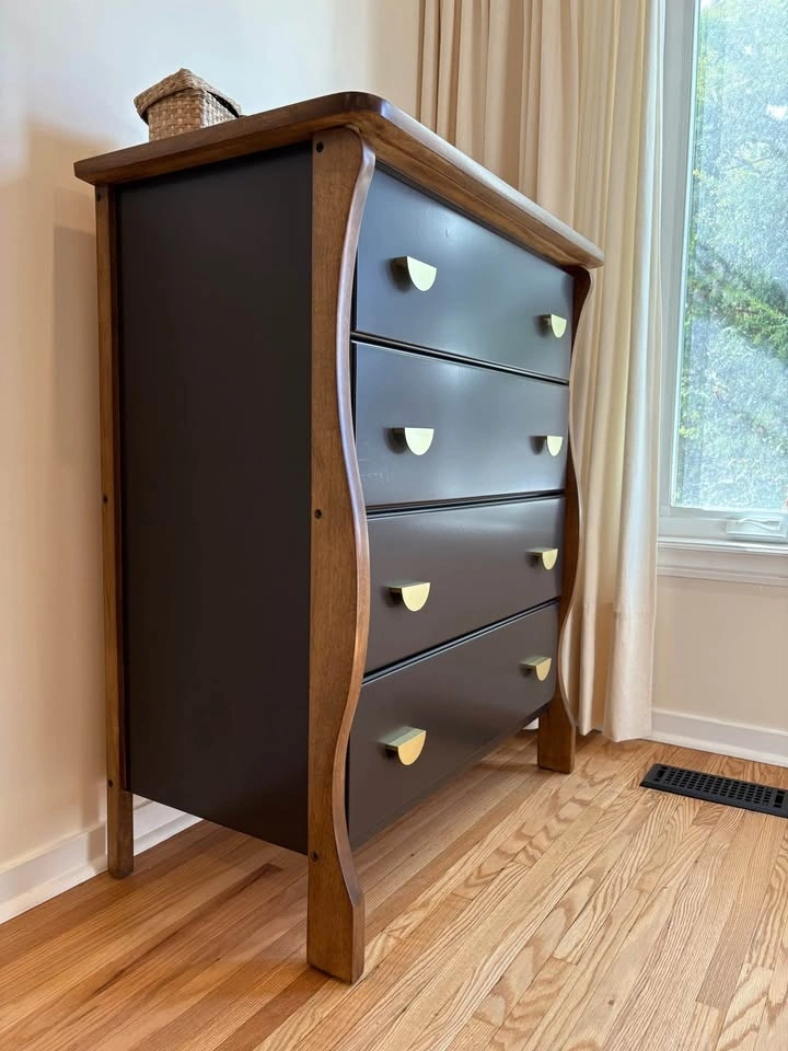 This one-of-a-kind dresser features a rich espresso finish, warm natural wood accents, and brass hardware. It was thoughtfully refinished to showcase its beautiful sculpted legs, which were intentionally left in a warm wood tone to highlight their character and create a striking contrast against the deep espresso body 🤎. It has a classic silhouette with a modern, elevated edge.
