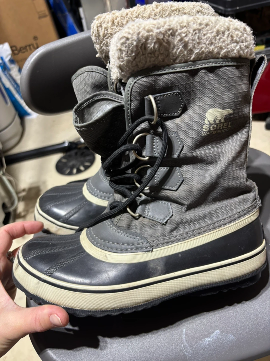 Sorel winter boots in grey and black. Faux fur lining. Women's size 7 (EUR 38, UK 5). These boots are waterproof and built for cold weather.