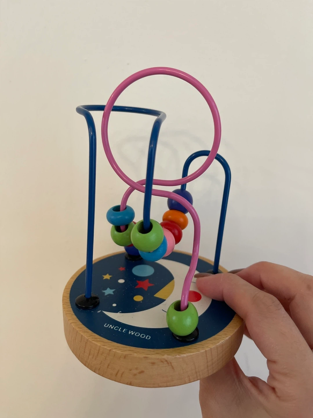 This is a wooden bead maze toy from Uncle Wood. It has colourful beads on a wire track. It's great for little hands to practice fine motor skills!