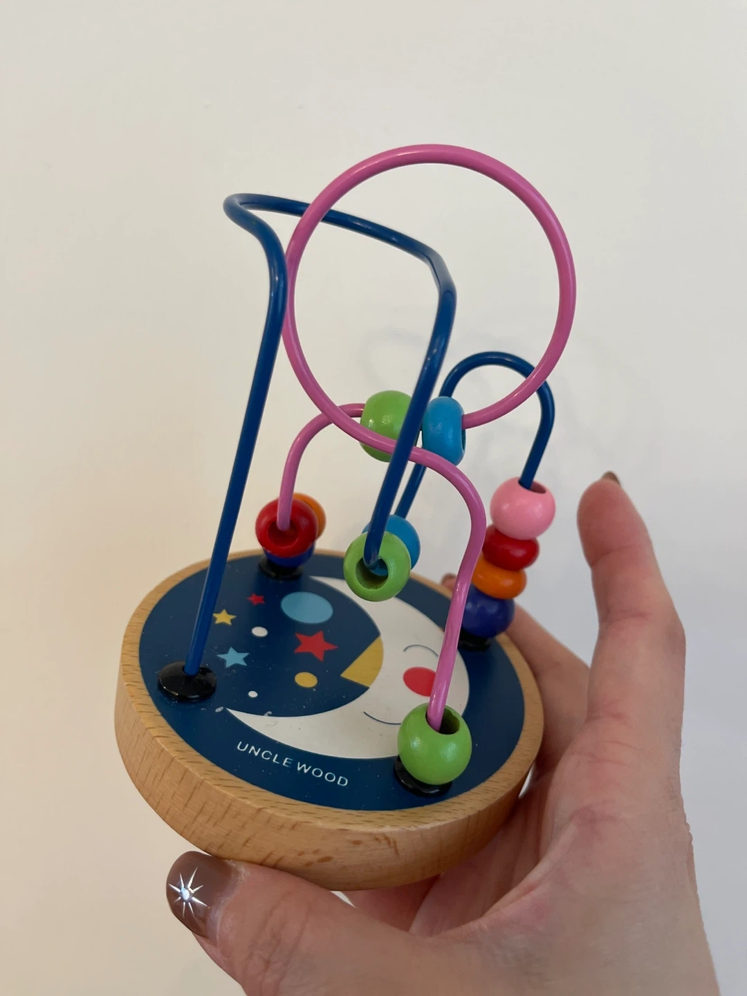 This is a wooden bead maze toy from Uncle Wood. It has colourful beads on a wire track. It's great for little hands to practice fine motor skills!
