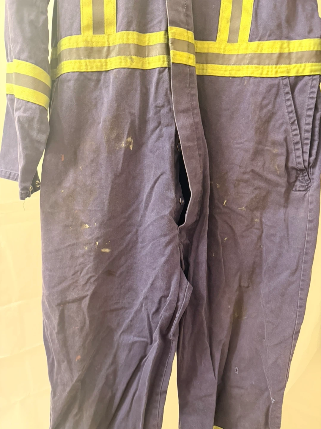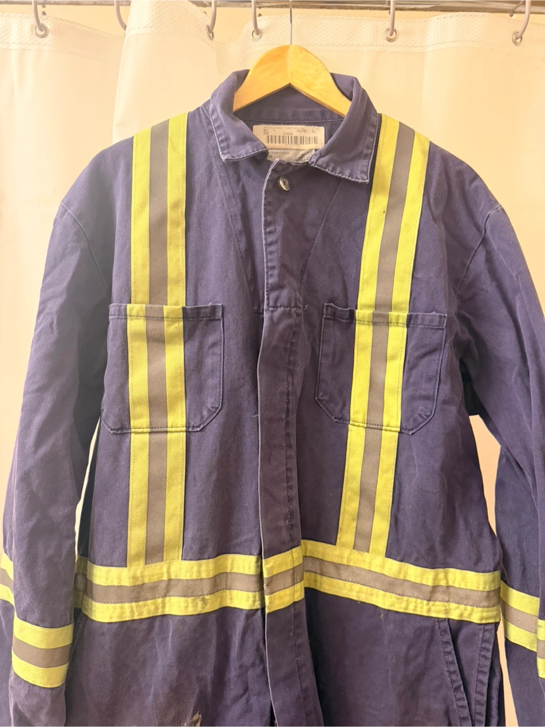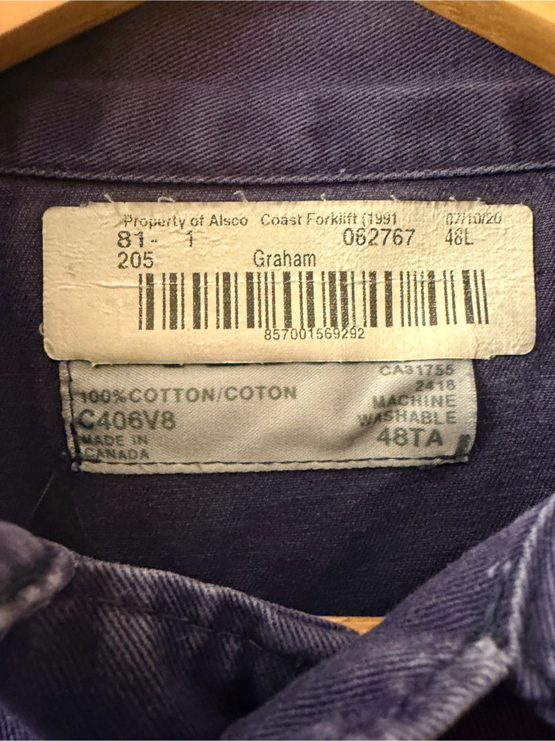 This is a pair of blue coveralls made by Alsco, size 48L. They're constructed from 100% cotton for comfort and durability. Reflective tape is added for enhanced visibility. Made in Canada.