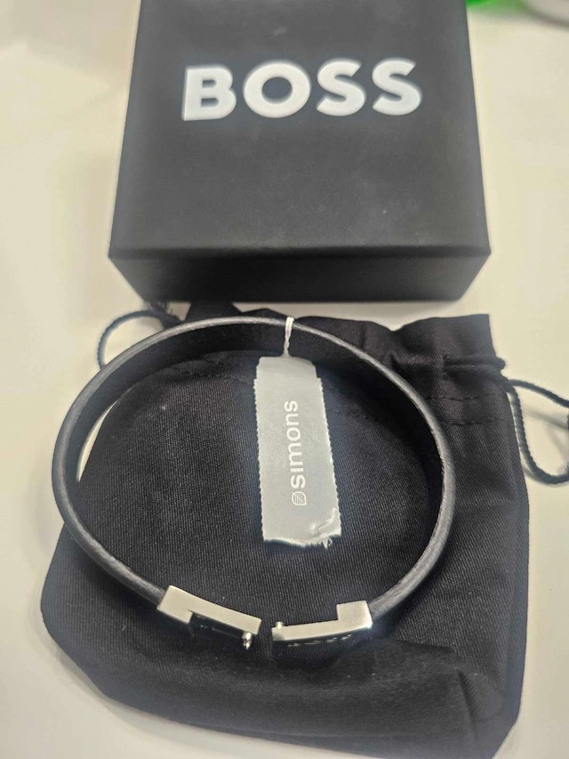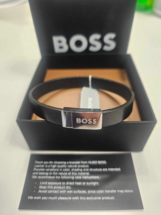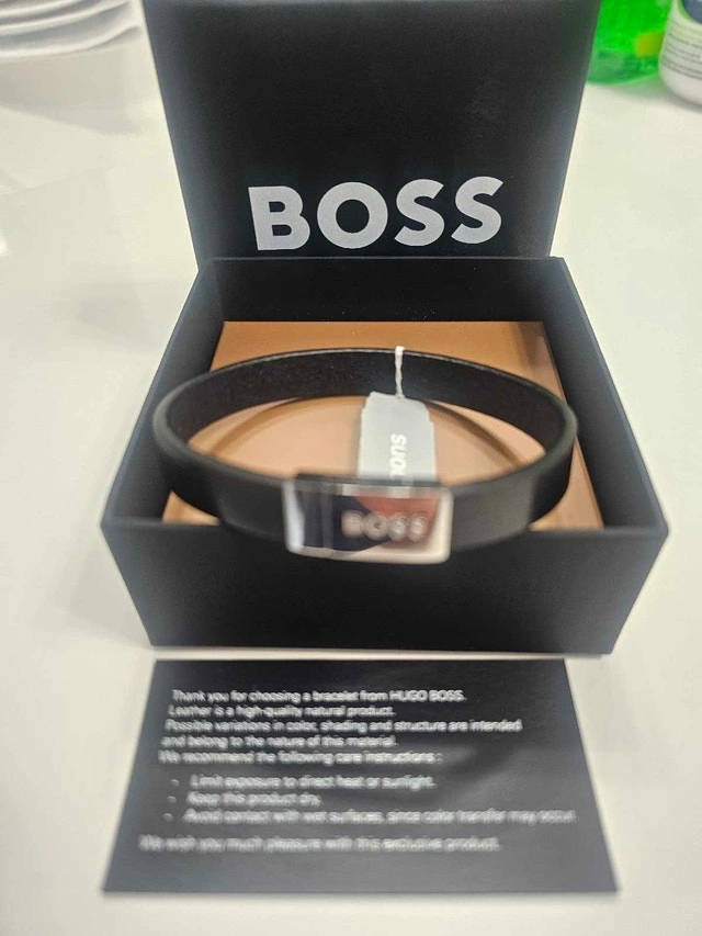 Elevate your style with this genuine Hugo Boss Lander bracelet (model 1580178M). Crafted from premium black braided leather with a polished stainless steel bar clasp engraved with the iconic "BOSS" logo. Magnetic closure makes it super easy to wear, and it's adjustable for a comfy fit (medium size, ~19cm/7.5" wrist). Condition: New. Cash accepted.
