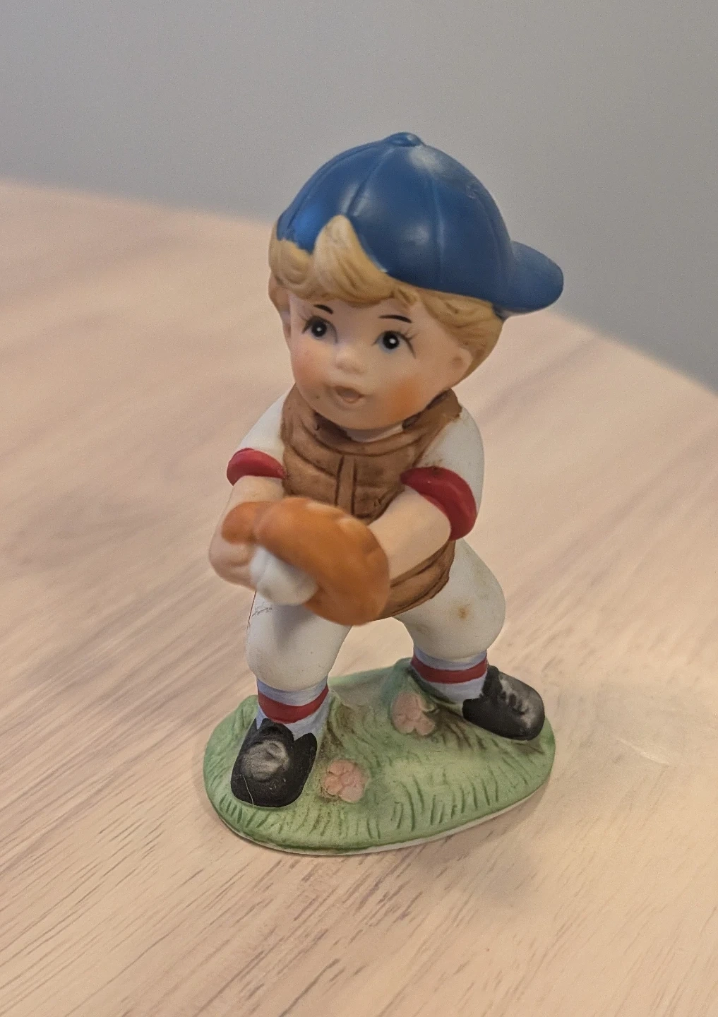 A charming ceramic figurine of a young boy playing baseball. It features a blue cap, catcher's mitt, and is set on a green grassy base with flowers. This collectible piece captures a moment of athletic play.