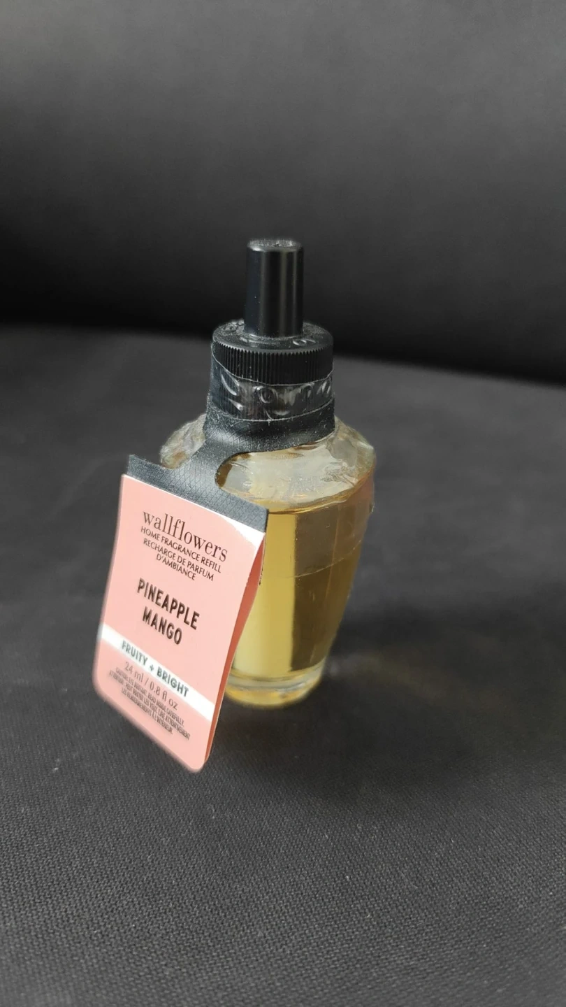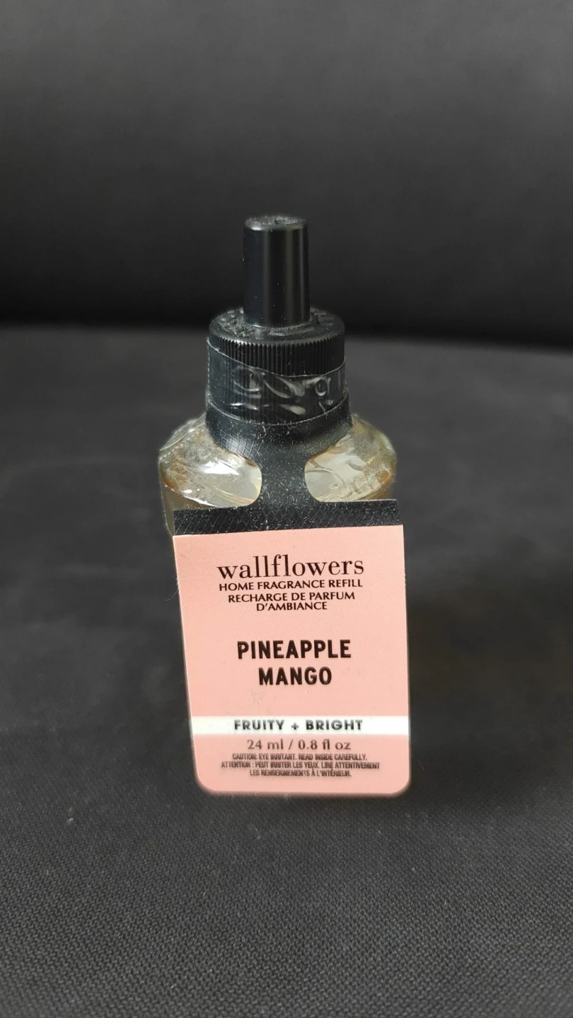 This is a Wallflowers home fragrance refill in Pineapple Mango scent. It contains 24 ml or 0.8 fl oz of liquid. The scent is described as fruity and bright. New and sealed.