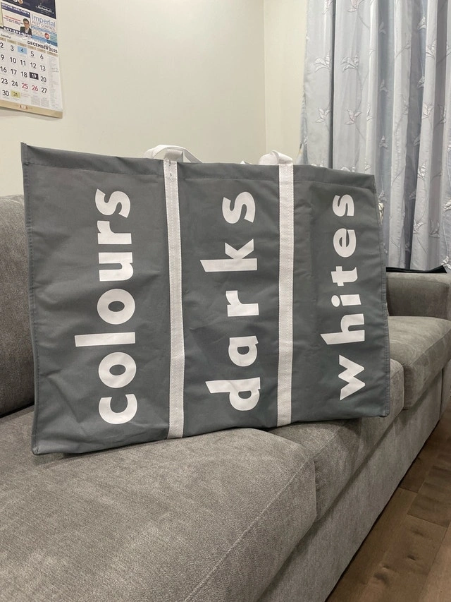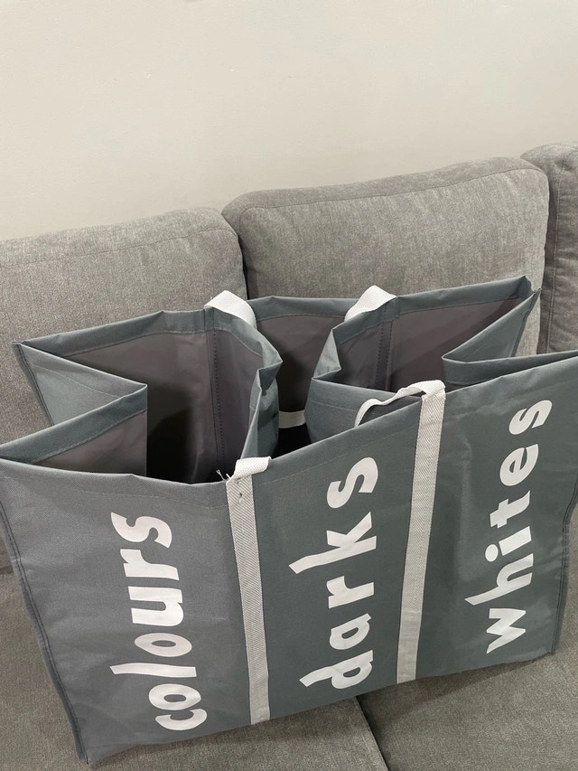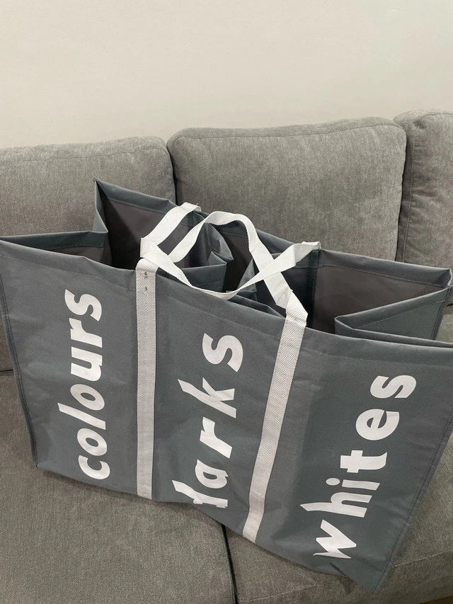 Keep your laundry organized with this handy three-section laundry sorter, perfect for separating colours, darks, and whites, making laundry day a breeze! This item is brand new and has never been used, ready to help you streamline your laundry routine.