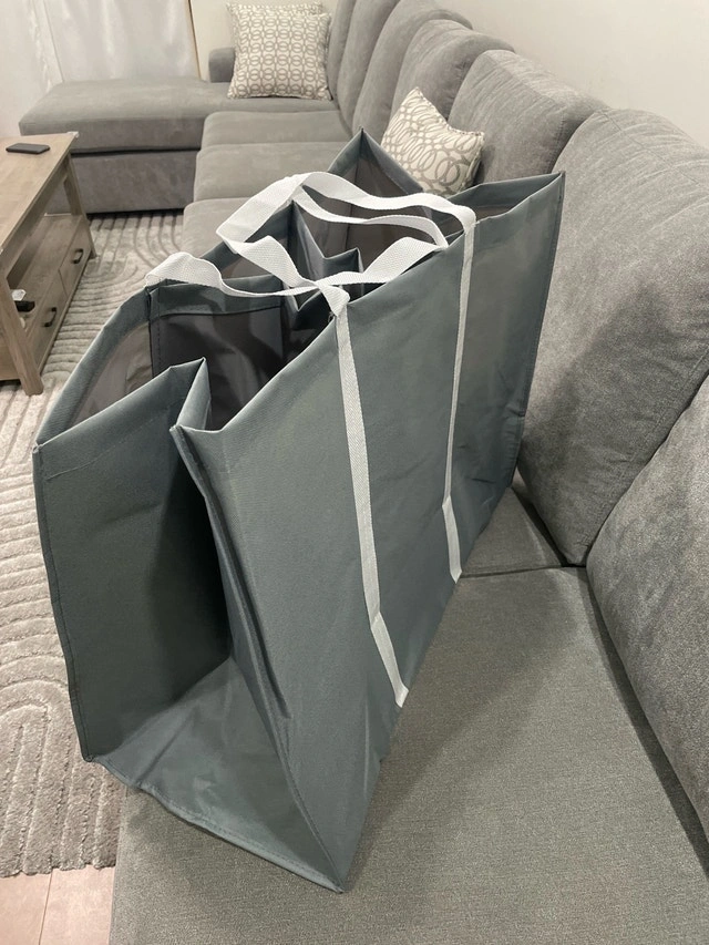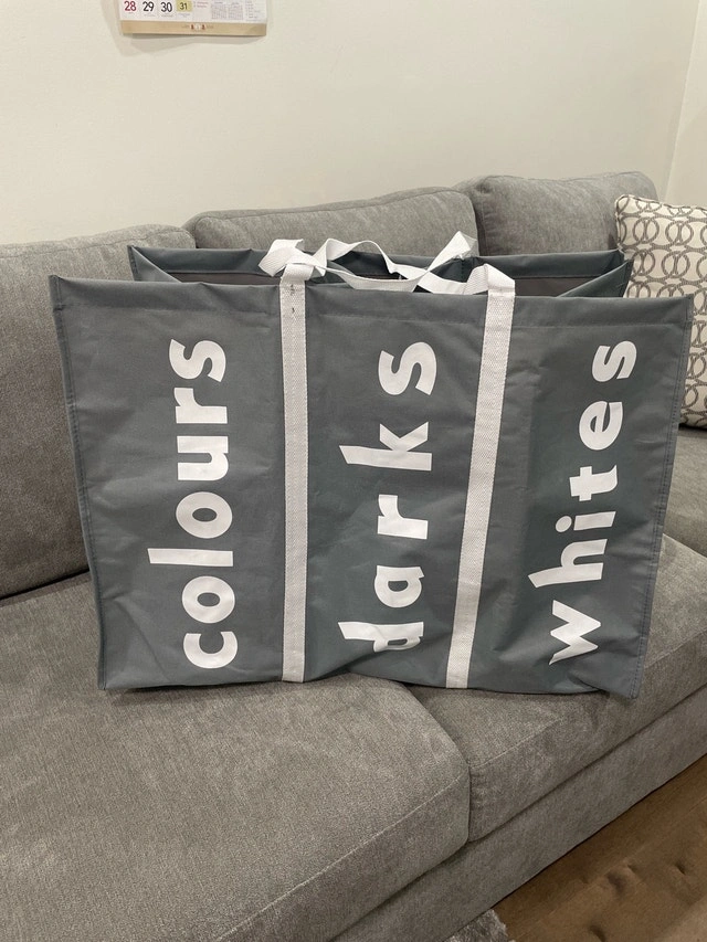 Keep your laundry organized with this handy three-section laundry sorter, perfect for separating colours, darks, and whites, making laundry day a breeze! This item is brand new and has never been used, ready to help you streamline your laundry routine.