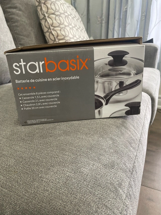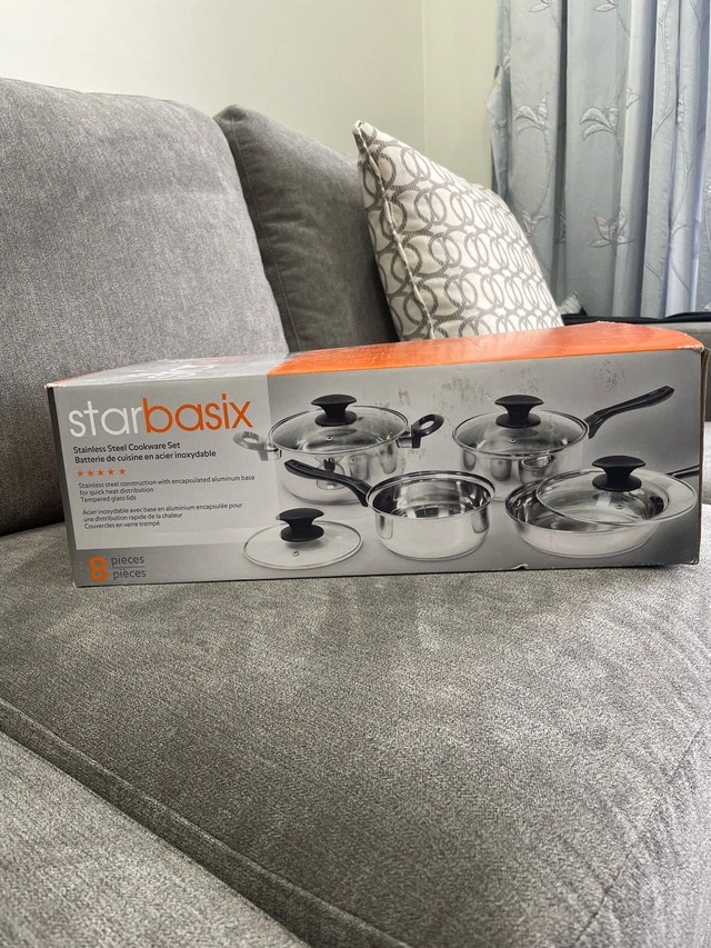 I'm selling a brand new Starbasix stainless steel 8-piece cookware set, complete with saucepans and a frying pan, all equipped with lids. This set is perfect for anyone looking to upgrade their kitchen essentials. * 1.6 qt Saucepan with lid * 2.1 qt Saucepan with lid * 3 qt Saucepot with lid * 8" Fry pan with lid