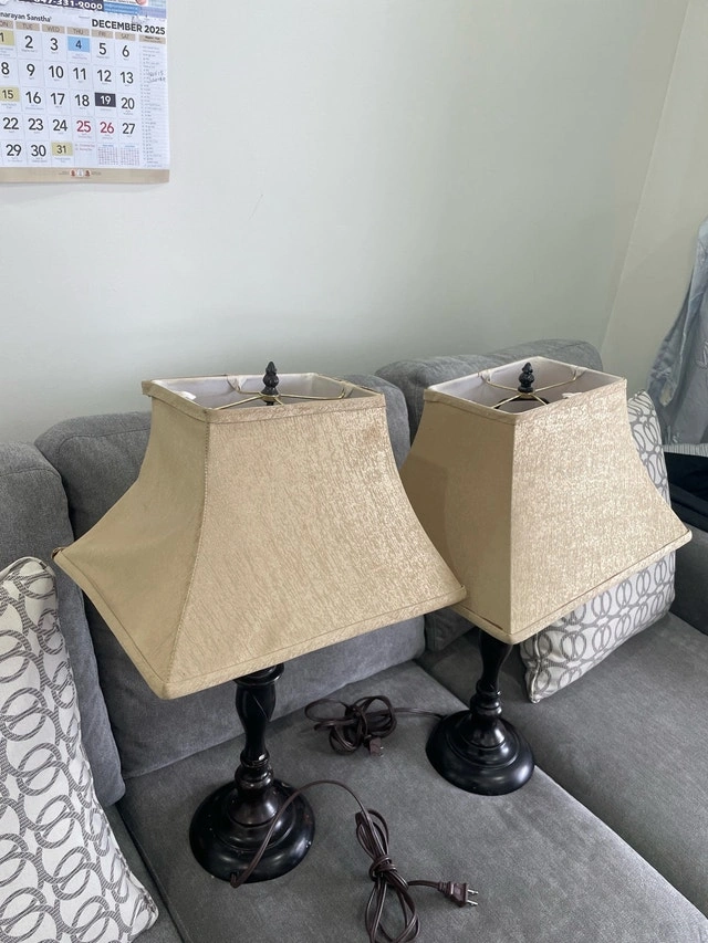 Brighten up your space with this set of two traditional table lamps, perfect for adding a touch of warmth to any room. These lamps have a beautiful dark wood base and neutral shade. They are used and in great condition, ready to light up your living space! Classic design, dark wood base, neutral shade. $40.00 for both. If the ad is still up, the lamps are still available!