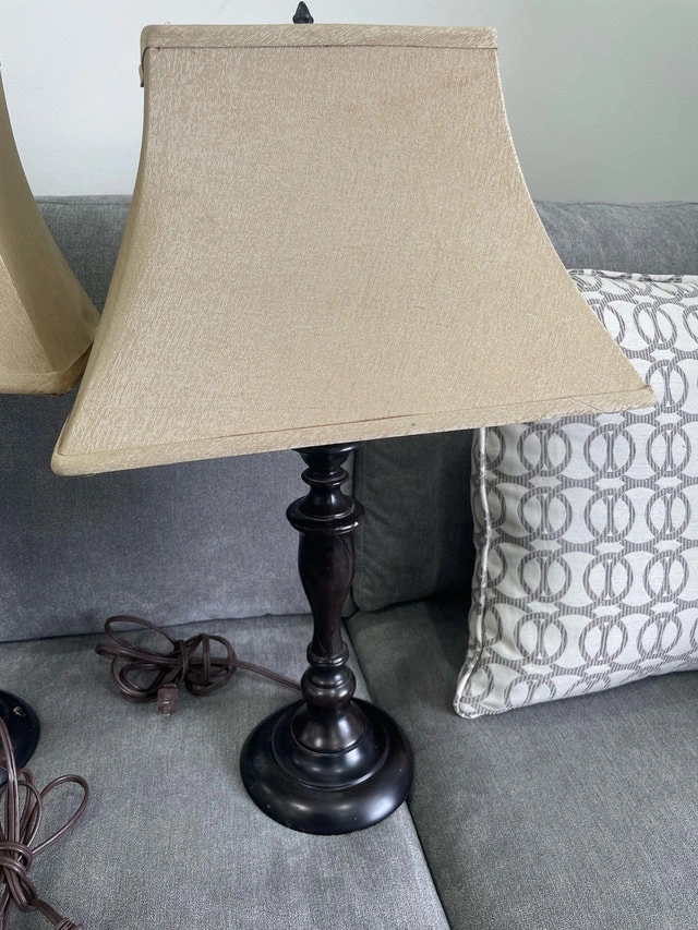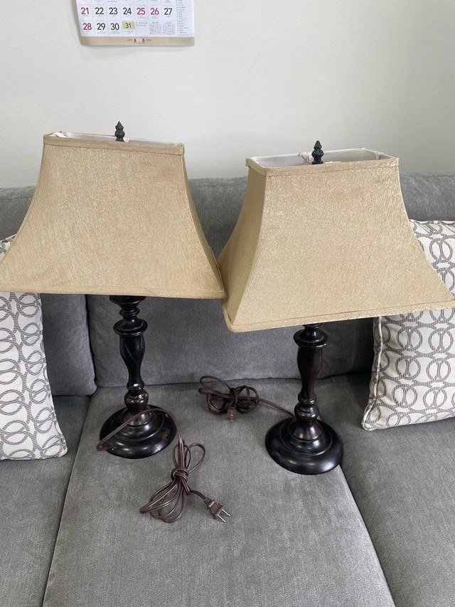 Brighten up your space with this set of two traditional table lamps, perfect for adding a touch of warmth to any room. These lamps have a beautiful dark wood base and neutral shade. They are used and in great condition, ready to light up your living space! Classic design, dark wood base, neutral shade. $40.00 for both. If the ad is still up, the lamps are still available!