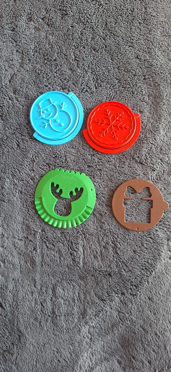 Get into the holiday spirit with these four Nutella stencils/imprints! It's a snowman, a snowflake, a reindeer, and a gift box shape. Plastic material.