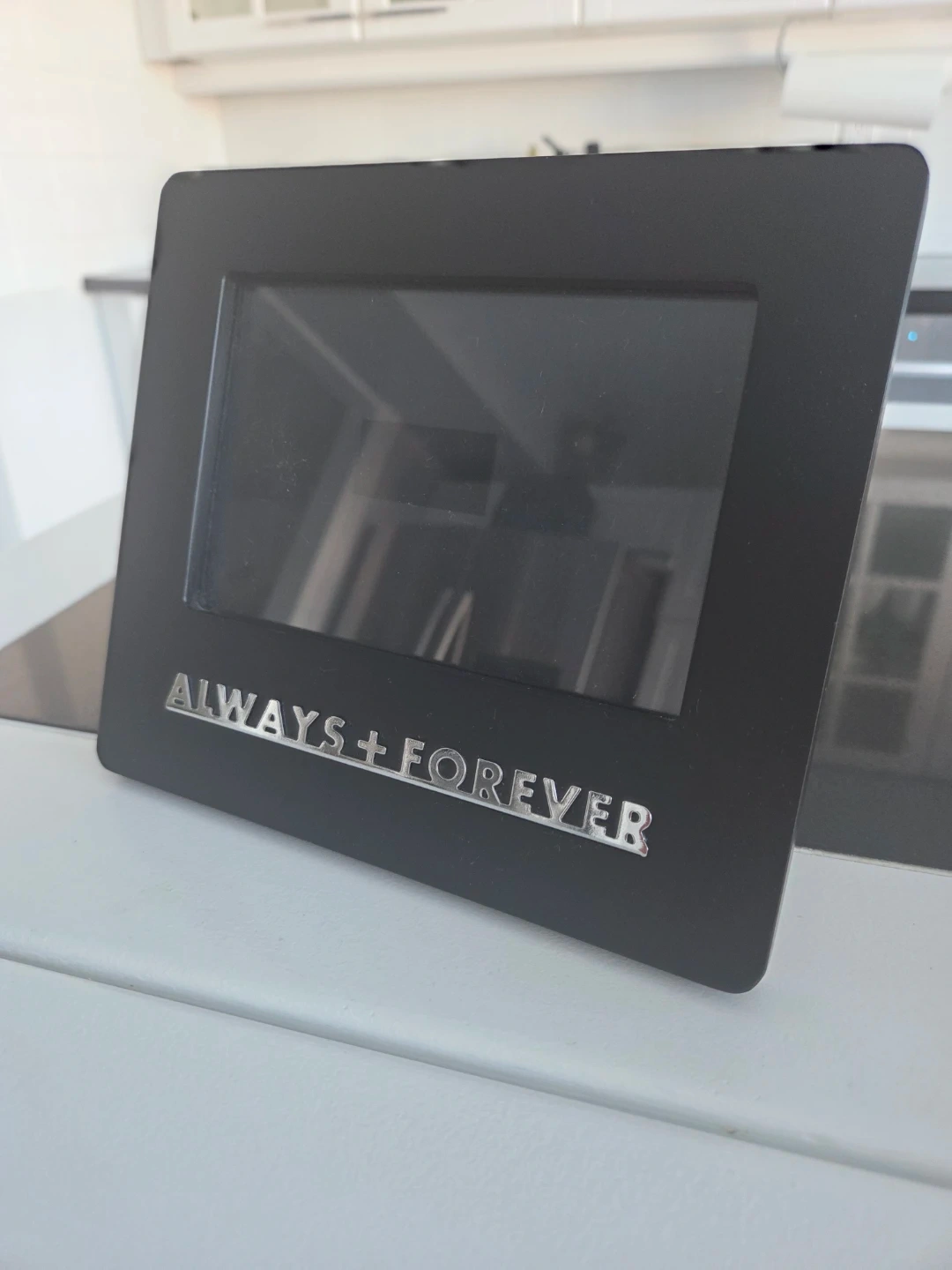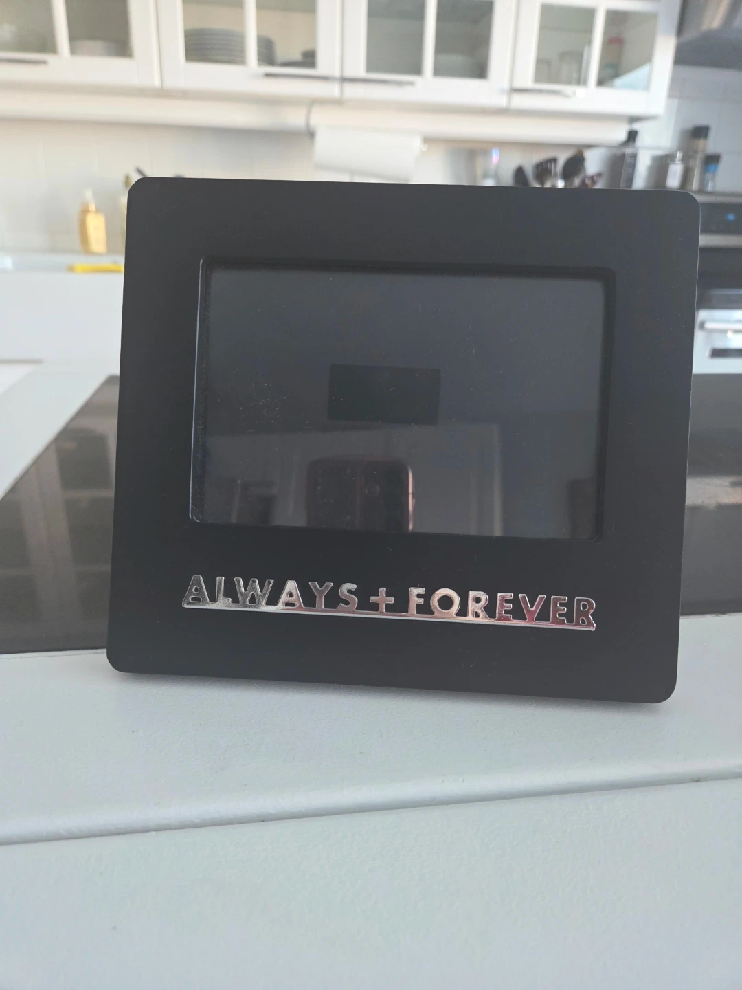 A black photo frame with "ALWAYS + FOREVER" printed on it. This frame holds a single 4x6 picture.