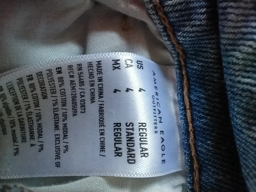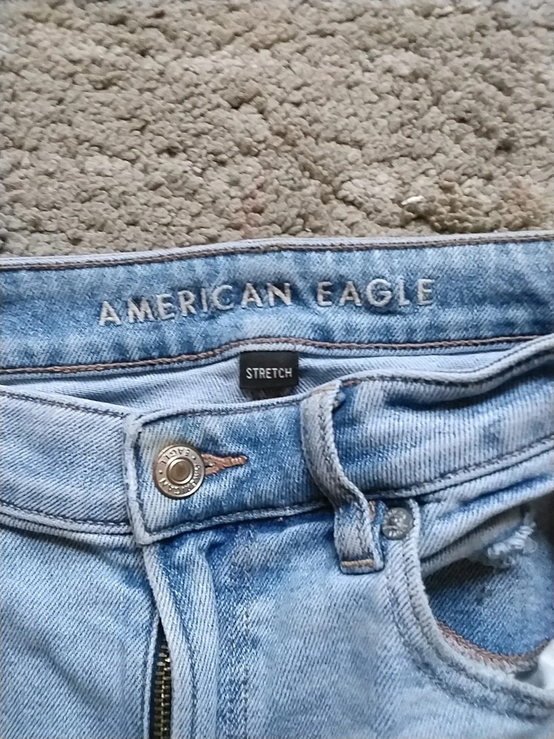 Light wash jeans from American Eagle. Made with a cotton and elastane blend for stretch. Features a regular fit and a cropped, raw hem.