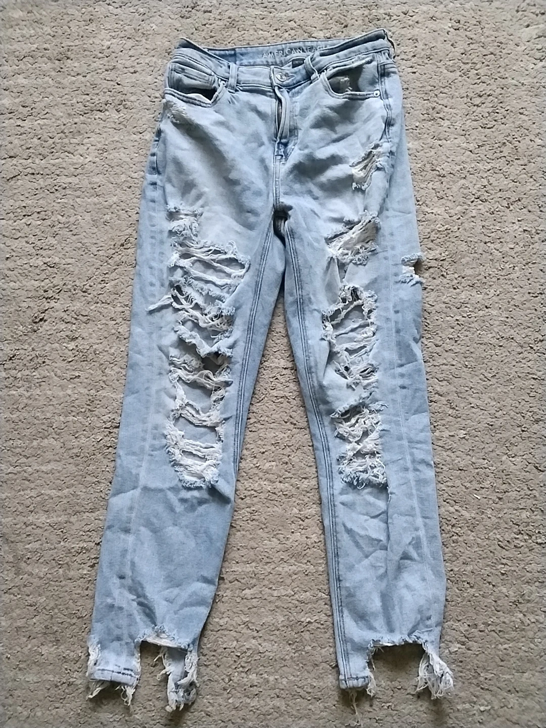 Light wash jeans from American Eagle. Made with a cotton and elastane blend for stretch. Features a regular fit and a cropped, raw hem.