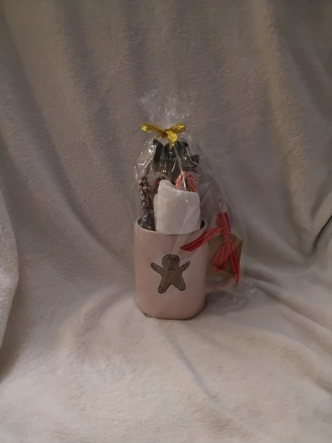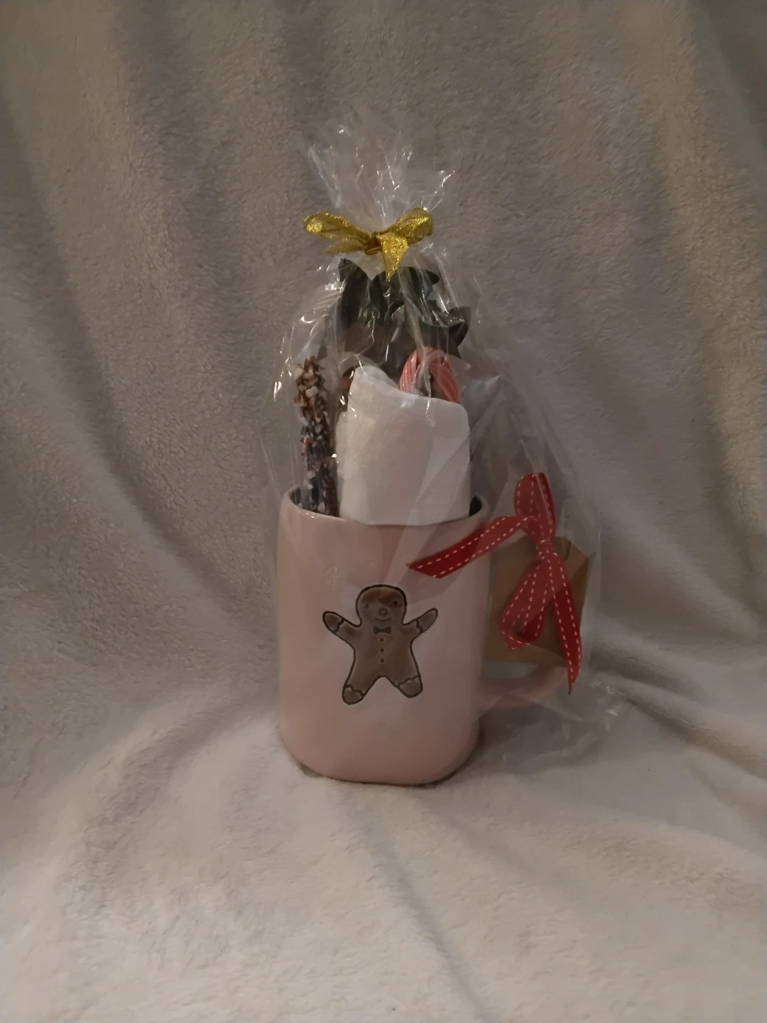 This cute pink mug features a gingerbread man design. It's filled with hot cocoa mix, a marshmallow, and festive chocolate treats. A sweet gift for the holidays!