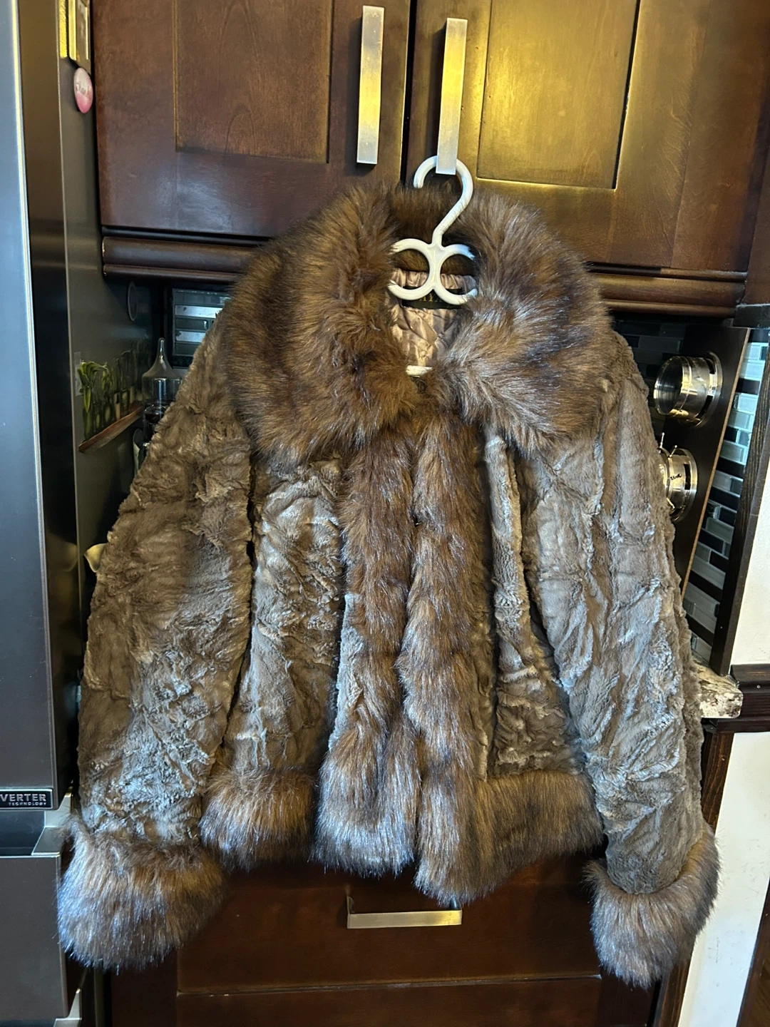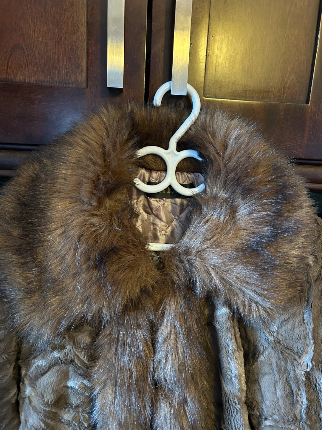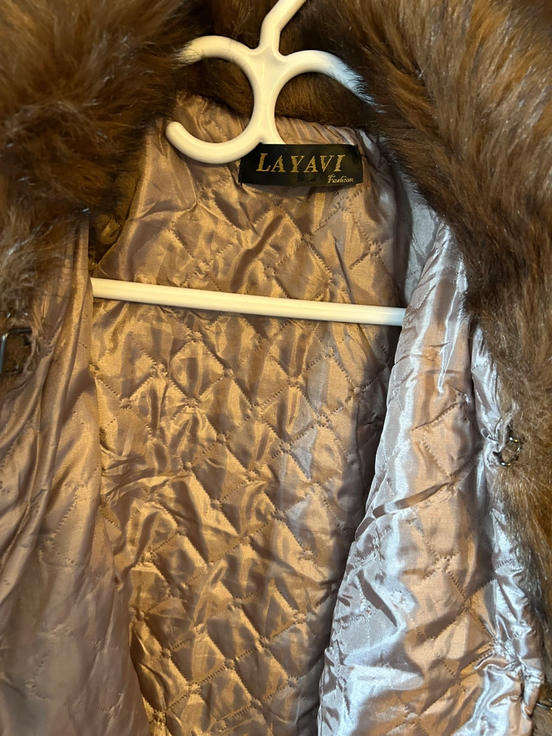 A stylish brown faux fur coat from LAYAVI Fashion. It features a soft quilted satin lining and a cozy faux fur exterior. This coat is perfect for adding a touch of luxury to your winter wardrobe!