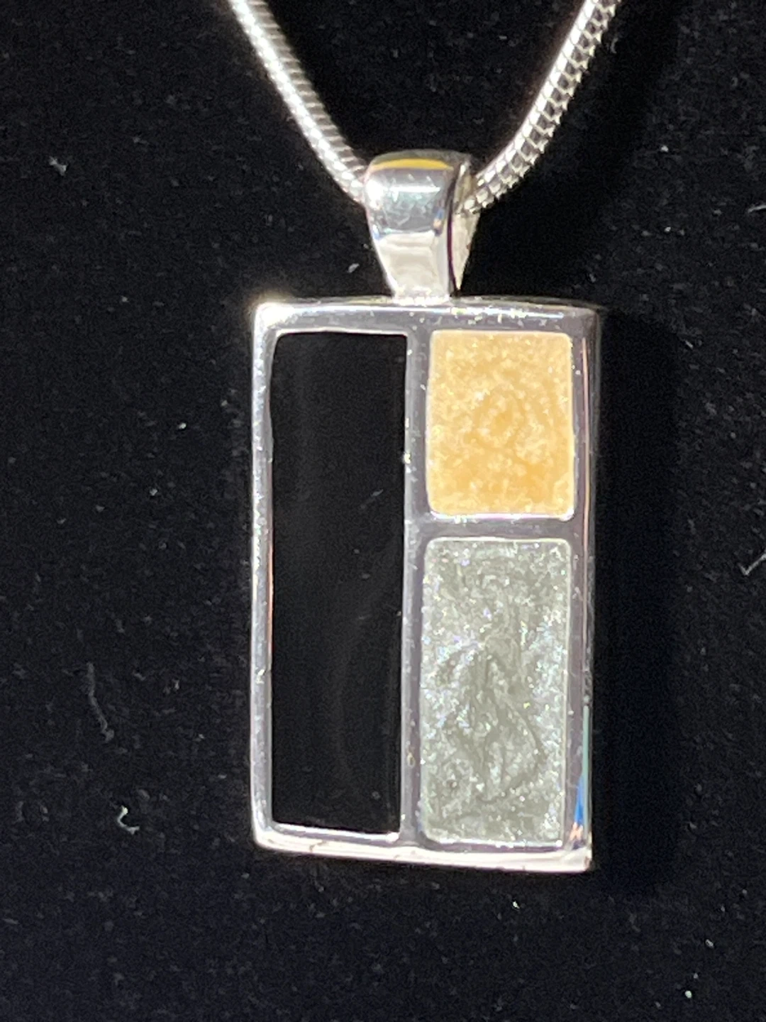 A stylish pendant necklace featuring a silver-tone chain and a rectangular pendant with a geometric inlay. The inlay has sections of black, a tan or goldish colour, and a grey, textured material. It's a unique piece for adding a pop of modern design to your outfit. The chain has an adjustable clasp.