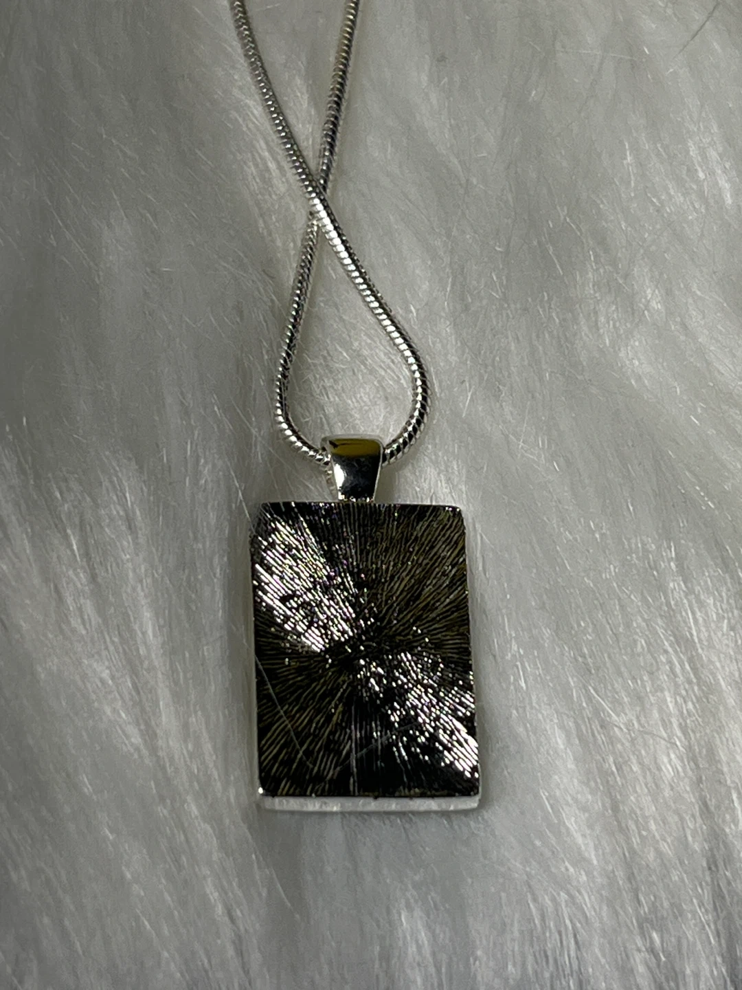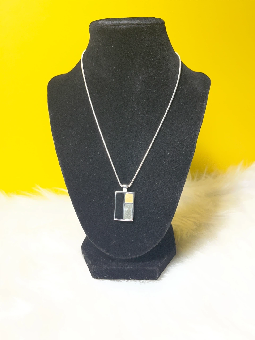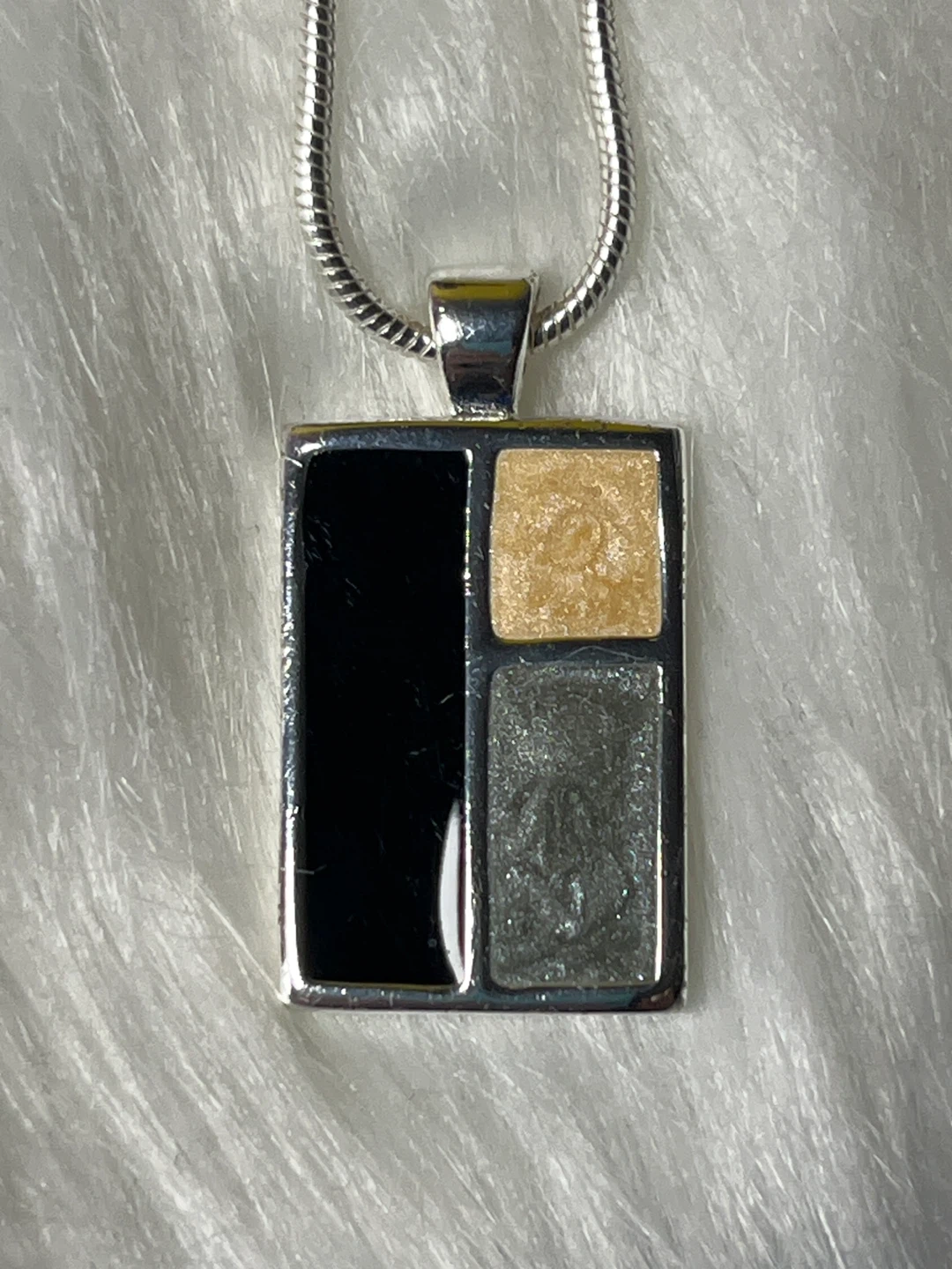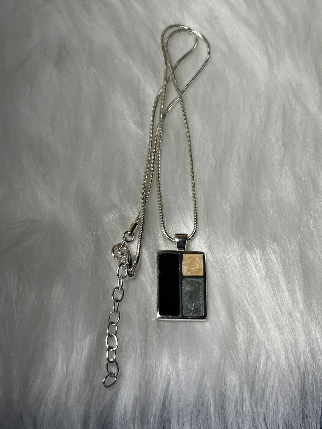 A stylish pendant necklace featuring a silver-tone chain and a rectangular pendant with a geometric inlay. The inlay has sections of black, a tan or goldish colour, and a grey, textured material. It's a unique piece for adding a pop of modern design to your outfit. The chain has an adjustable clasp.