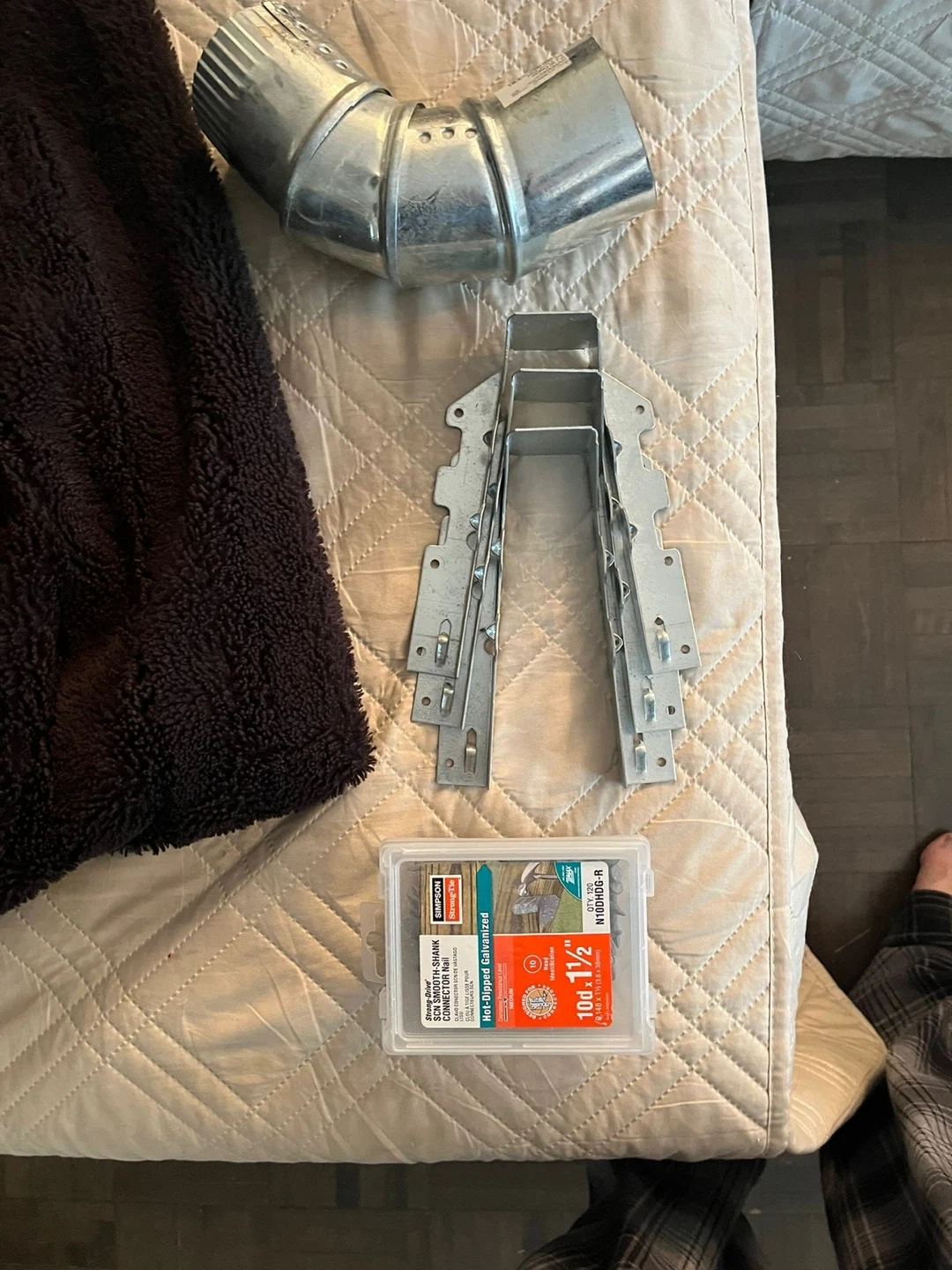 Lot includes Simpson Strong-Tie 10d x 1-1/2" hot-dipped galvanized connector nails. Also includes metal joist hangers and a galvanized duct elbow. Nails are 120 per box.