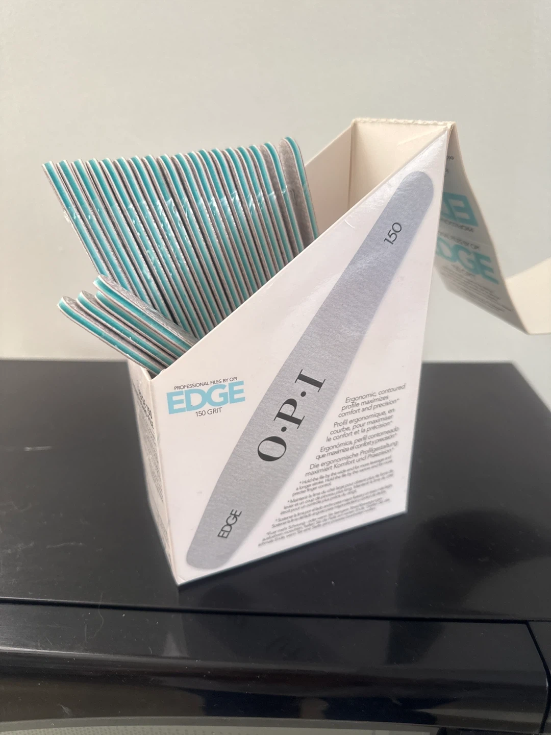 OPI EDGE 150 Grit professional nail files. Ergonomic, contoured profile maximizes comfort and precision. Comes in a dispenser box with many files inside. 20 pieces