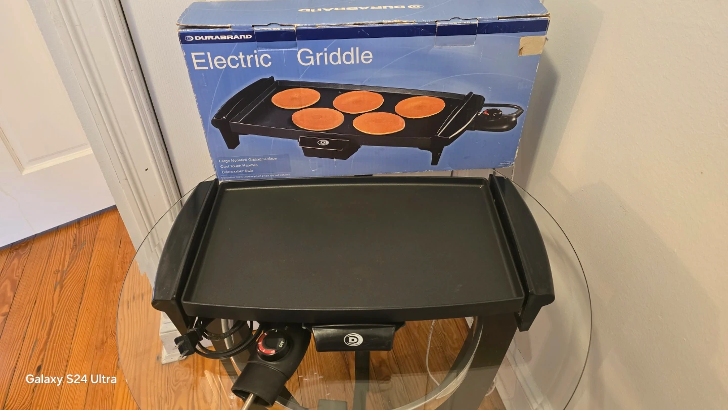 This Durabrand electric griddle features a large nonstick grilling surface. It has cool-touch handles and is dishwasher safe. This griddle is great for making pancakes and other breakfast foods!