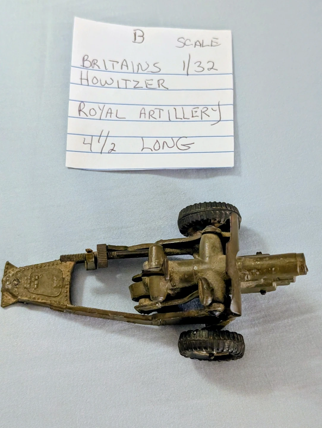 This is a Britains Royal Artillery Howitzer toy. It's 1/32 scale and measures 4 1/2 inches long. It's made of metal.