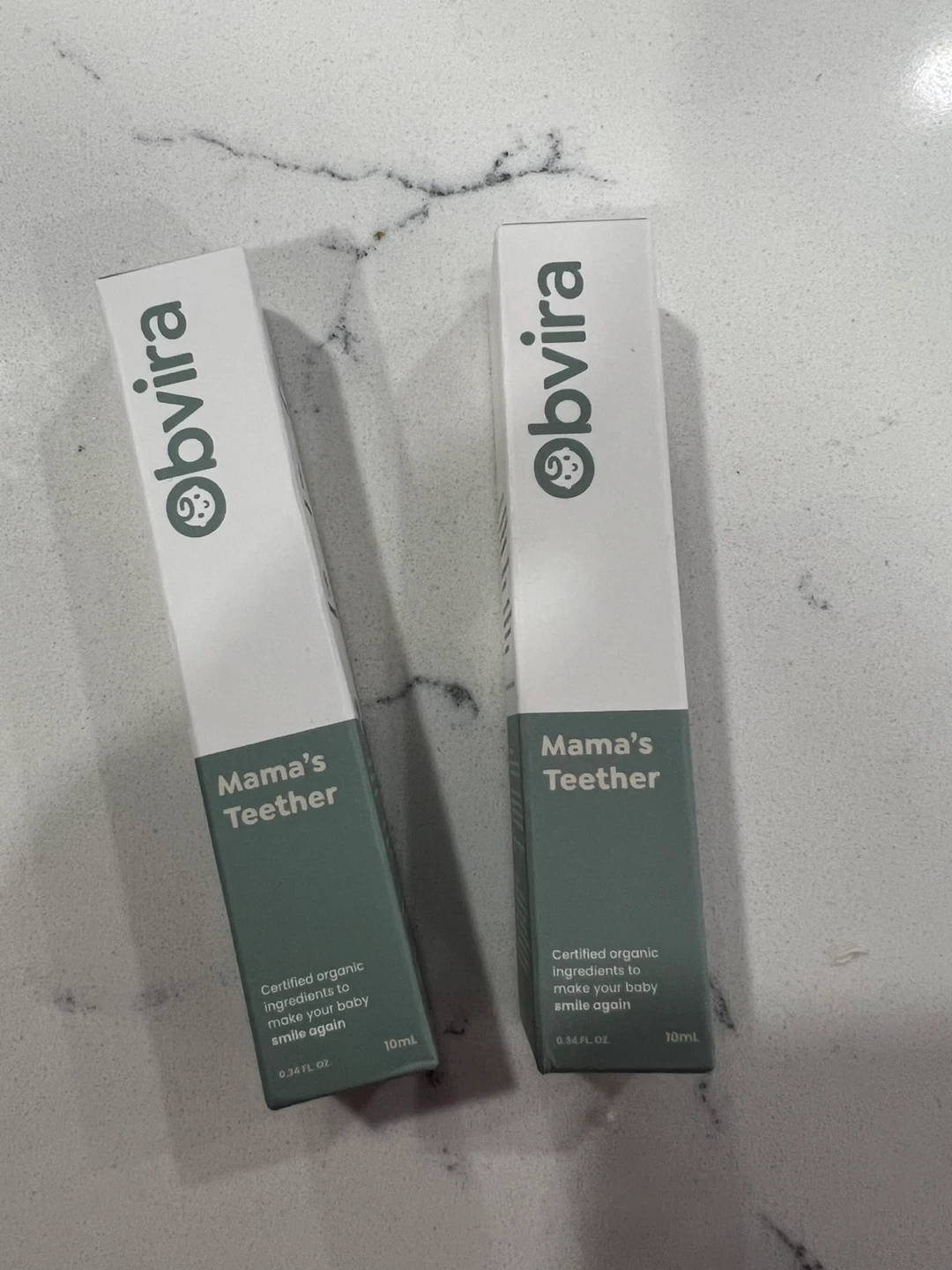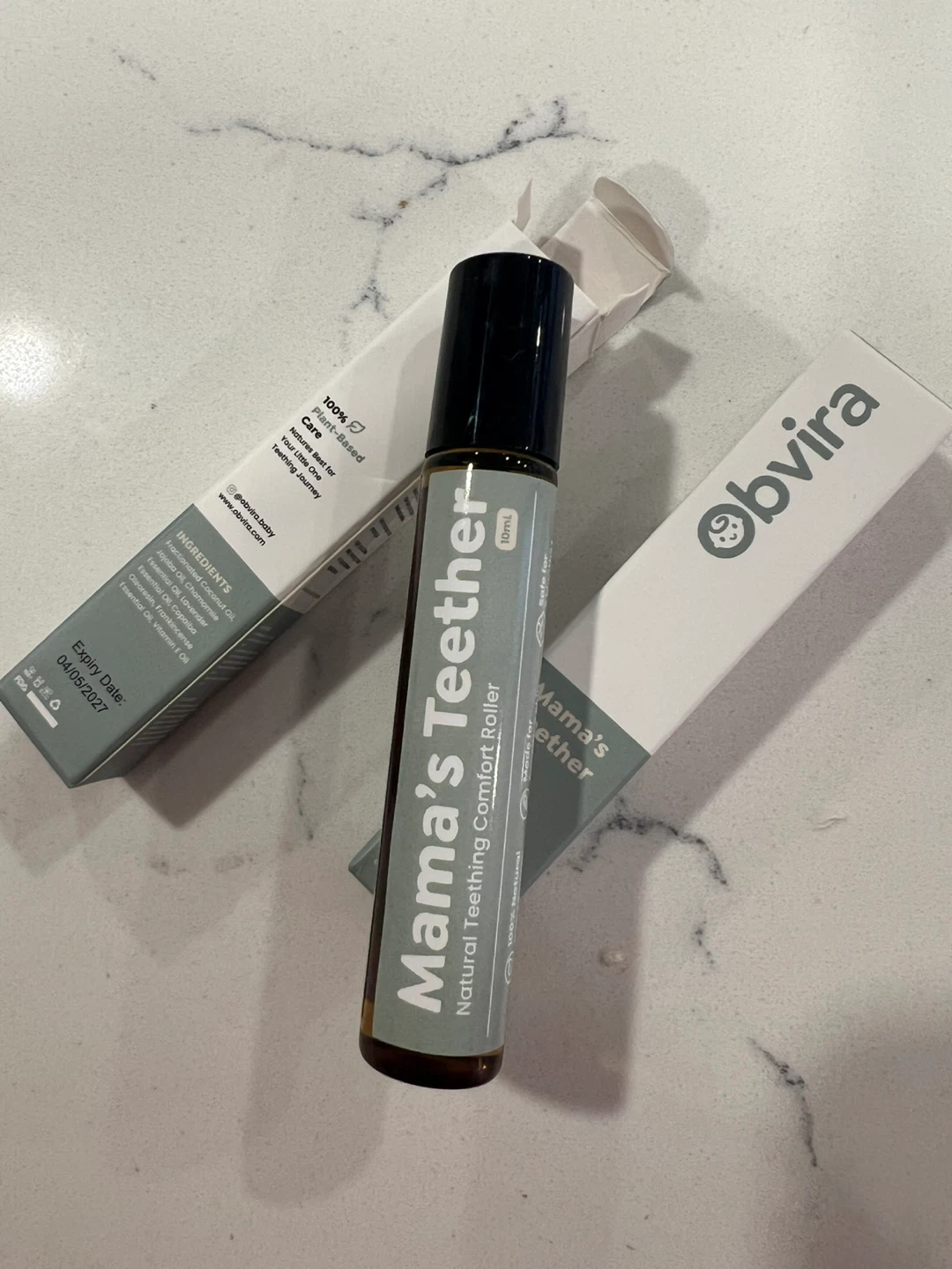 This is Obvïra Mama's Teether, a natural teething comfort roller. It's made with certified organic ingredients and contains fractionated coconut oil, jojoba oil, chamomile, lavender, peppermint, frankincense essential oils, and vitamin E oil. Expiry date is 04/05/2027.