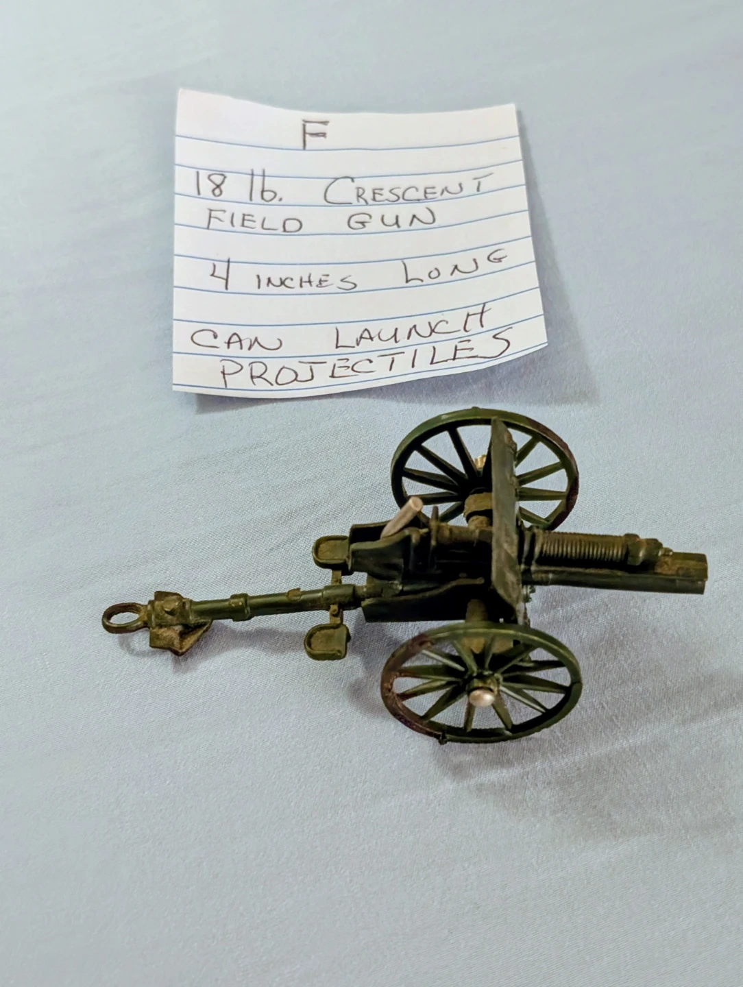This is an 18 lb. Crescent Field Gun model that's 4 inches long. It can launch projectiles. This would be a fun display piece for history buffs!