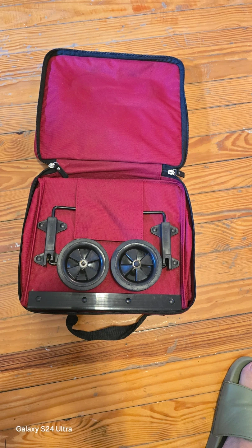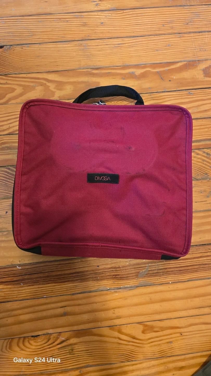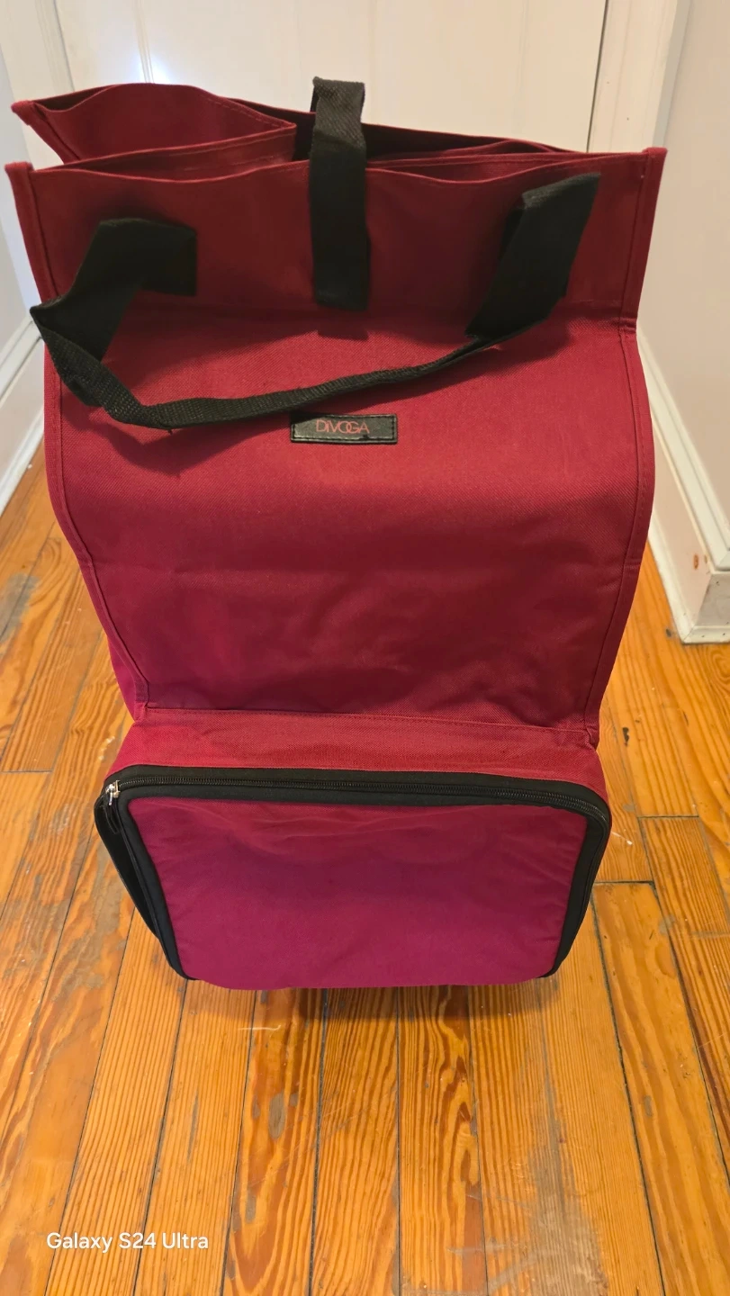 This is a red rolling shopping bag from DIVOGA. It's made of durable fabric and features two wheels for easy transport. The bag has a main compartment and a zippered front pocket.