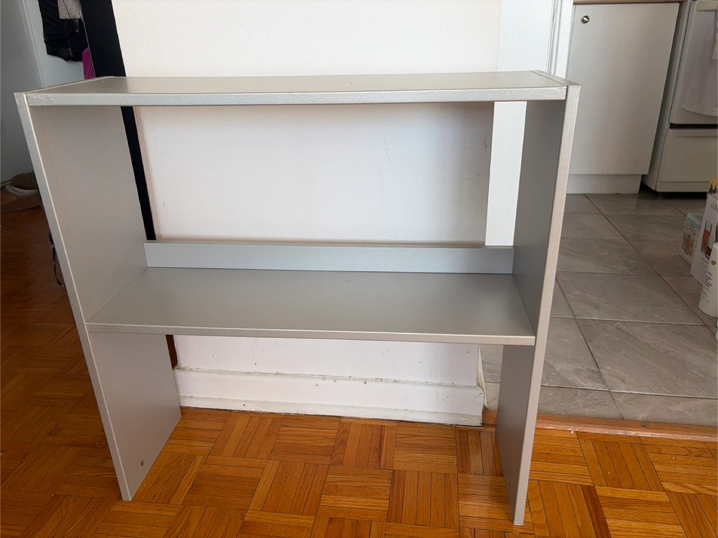 This is a silver two-tier shelf unit. offers simple storage. Could be used for books or decorative items. 26-27” length and height & about 8.5” width