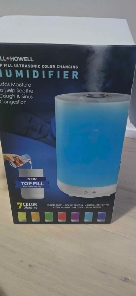 This LL Howell humidifier adds moisture to help soothe cough and sinus congestion. It's whisper silent and features a top-fill design for easy refills. The unit also has a color-changing light effect and can be used as an aroma diffuser.
