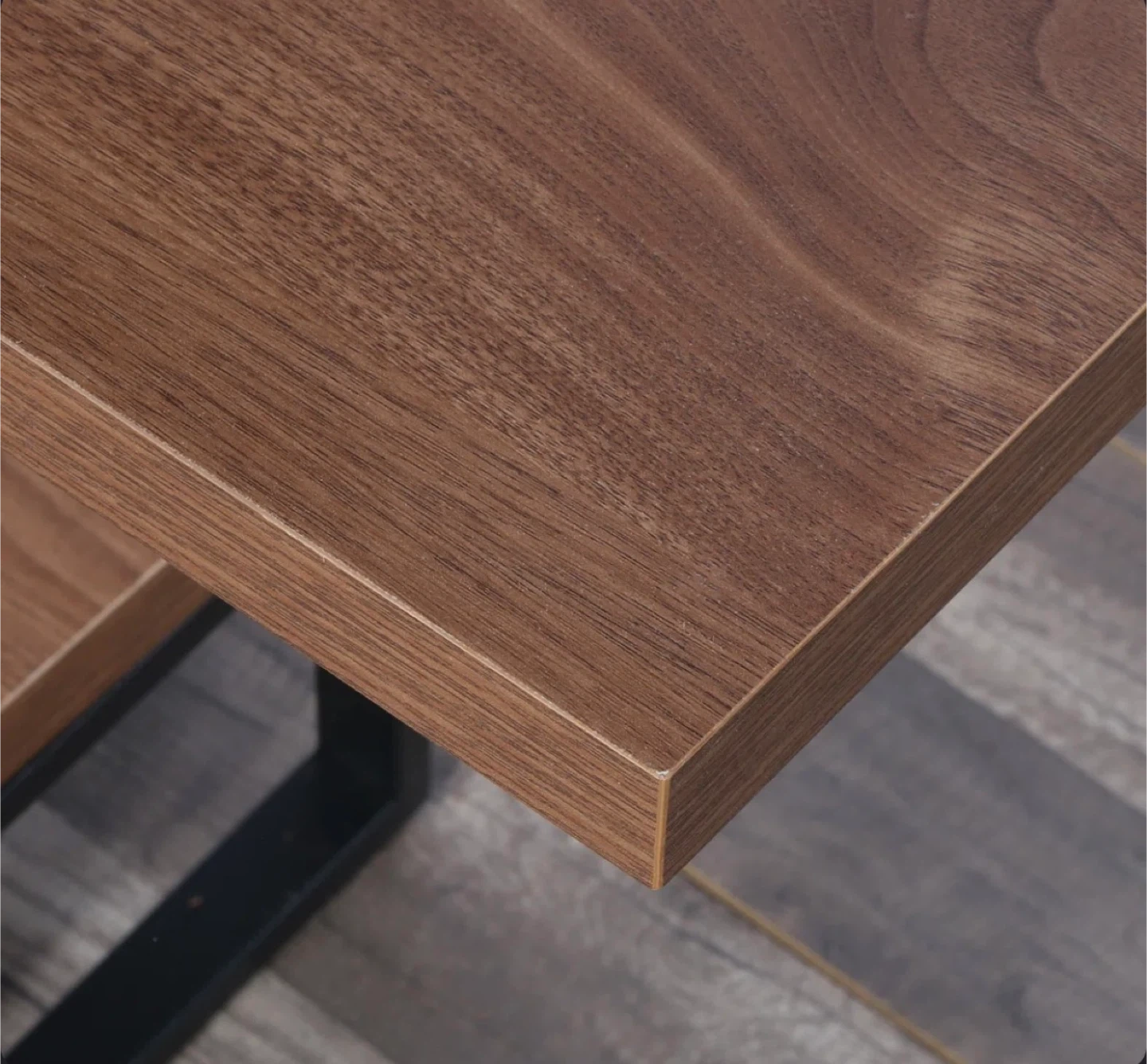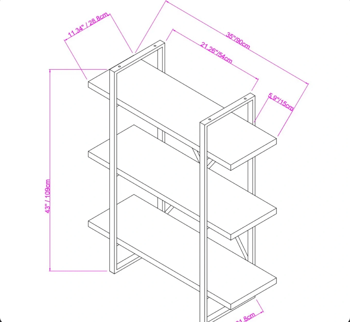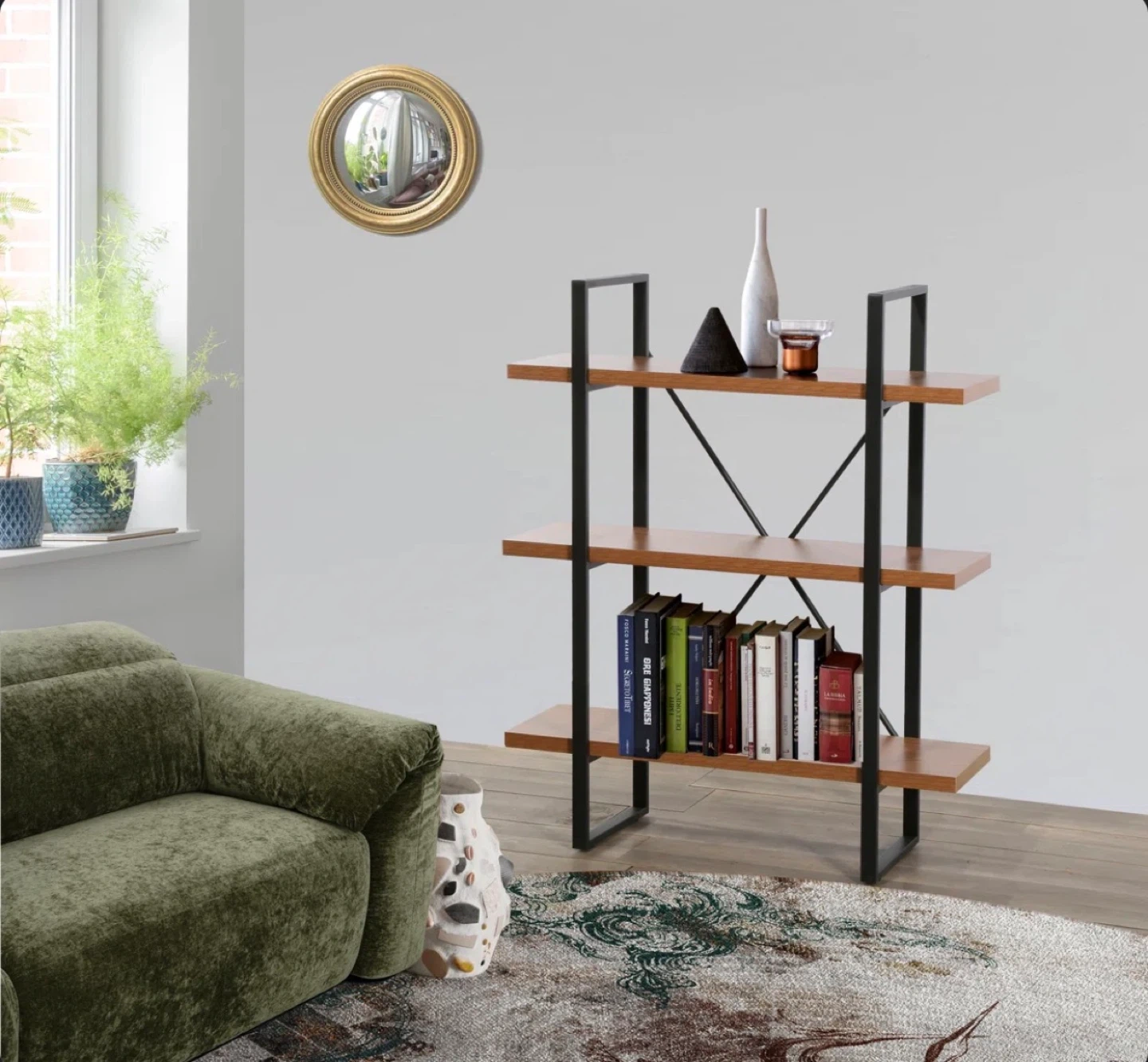 This three-shelf etagere bookcase features a metal frame with wood-look shelves. It's 43" high and 35" wide. The shelves are 11.34" deep.
