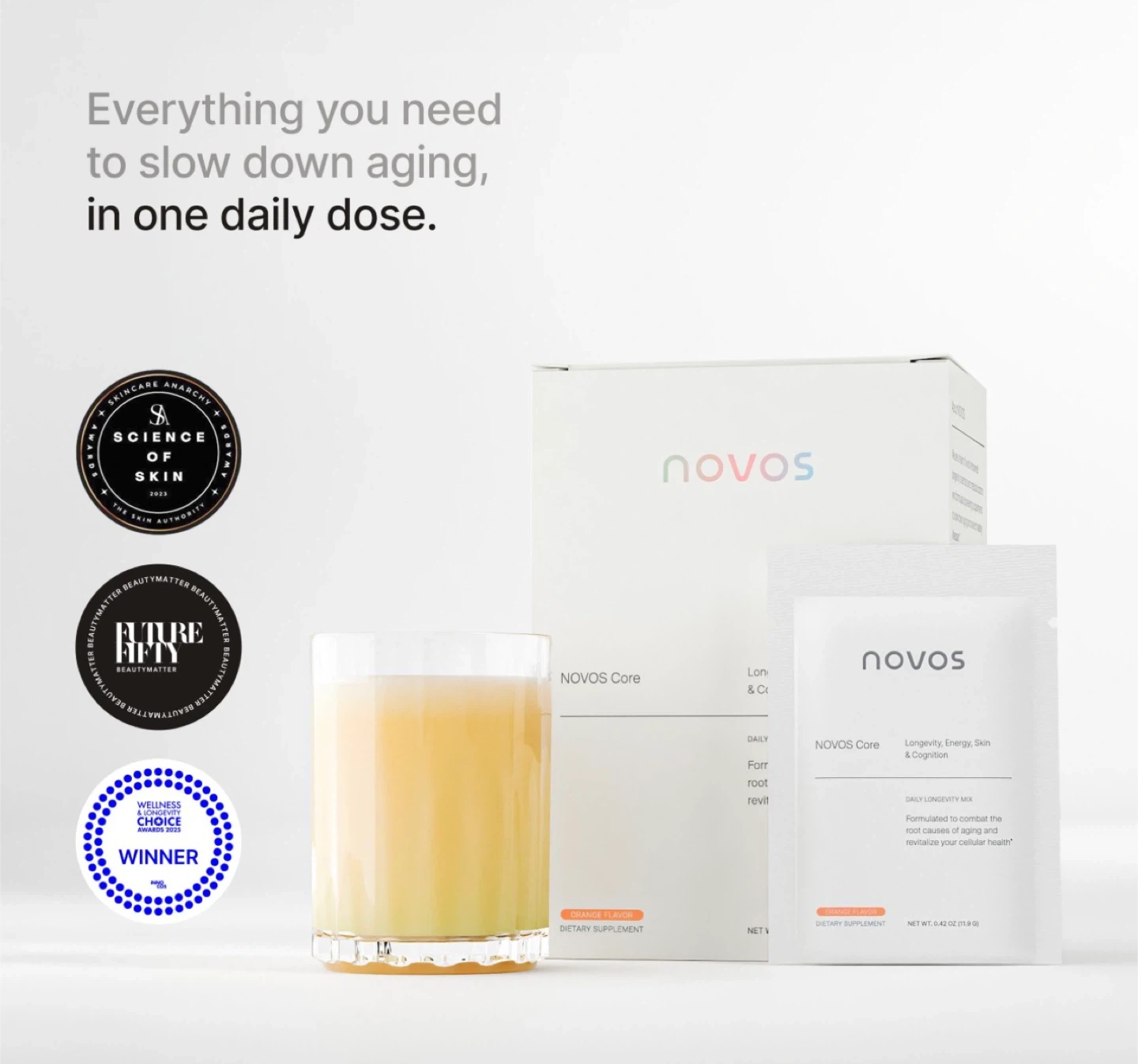 Key Benefits: NOVOS Core targets the 12 root biological causes of aging simultaneously at the cellular level using an evidence-backed ingredient formulation based on the latest longevity science. Each sachet contains 0.24 oz of a proprietary, patent-pending blend of 12 life and health-enhancing ingredients extensively studied to slow the pace of aging and improve your skin health, energy, brain cognition, and mood.