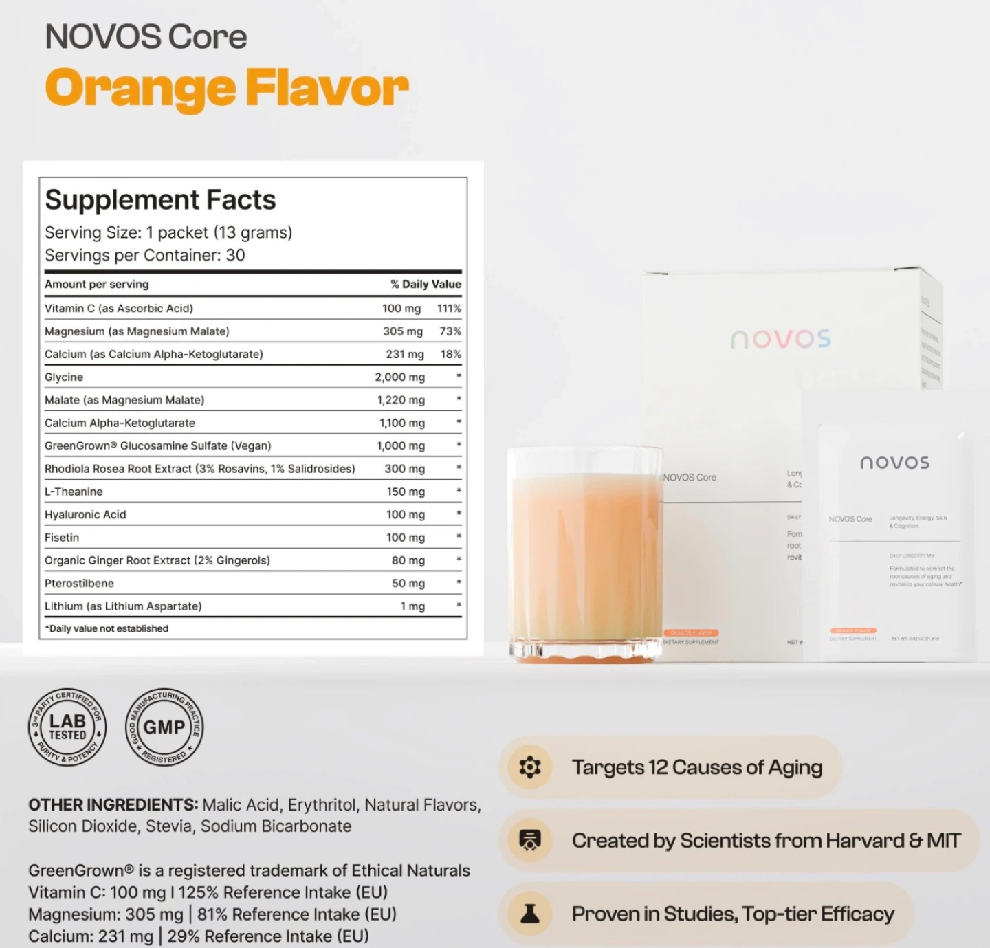 Nature-Based: The ingredients we chose are found in food or human biology, and contain high-quality ingredients at optimal dosages including magnesium, vitamin C, ginger, hyaluronic acid, L-theanine, glycine, rhodiola rosea, fisetin, glucosamine sulfate, pterostilbene, calcium alpha-ketoglutarate, and magnesium malate to address multiple mechanisms of aging. NOVOS Core contains zero calories and sugar, is all-natural, vegan, and gluten-free, and is third-party tested and manufactured in the USA. RECOMMENDED USE: Add 1 sachet of powder to water, juice, smoothie, yogurt, tea, or your beverage of choice, preferably with or after a meal. You can take up to two sachets per day as part of your daily routine. Each box contains 30 servings for a one-month supply.