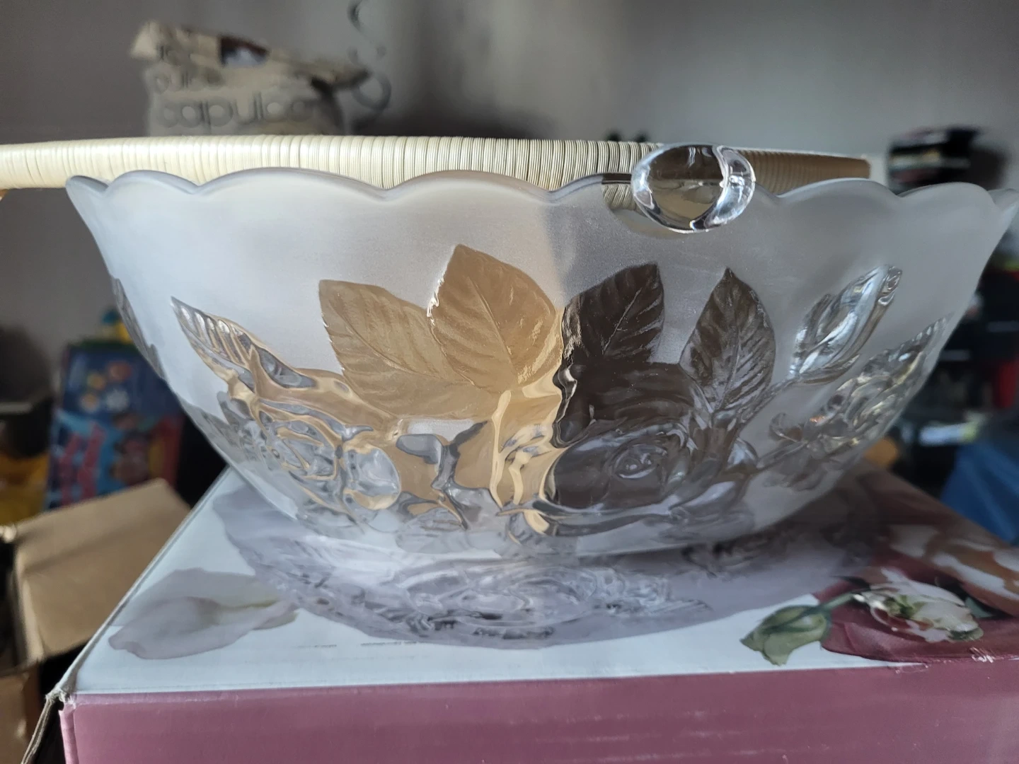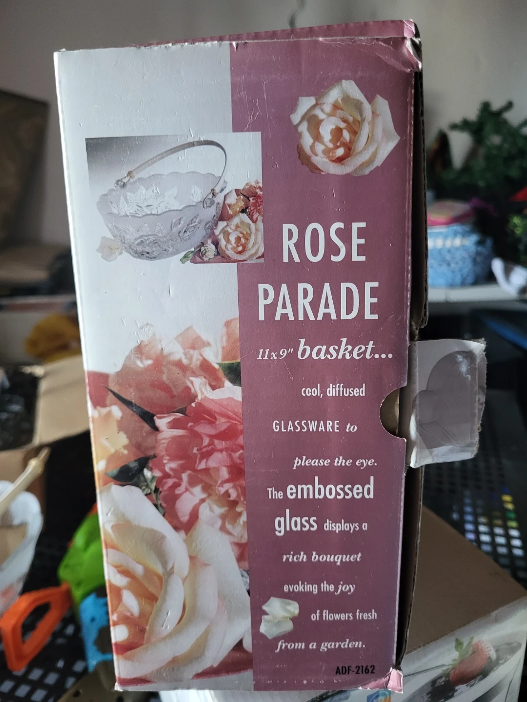 This Rose Parade basket is made of cool, diffused glassware with an embossed rose bouquet design. It measures 11 by 9 inches. It's perfect for displaying flowers fresh from the garden. Can also be used as a fruit bowl. It's multifunctional.
